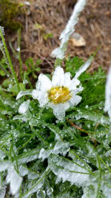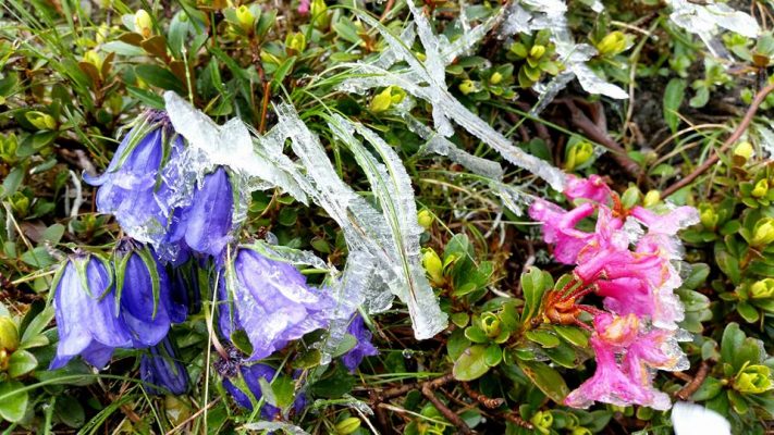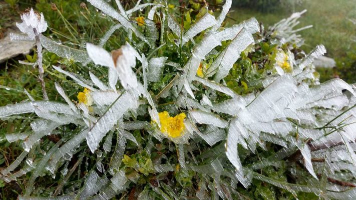 În toiul verii (calendaristice) la munte peisajul a devenit hibernal. Plăpândele flori au fost învelite într-o colivie de gheață. Florile înseamnă viață, bucurie. Fragilitatea lor s-a transformat într-un “monument” natural impunător.