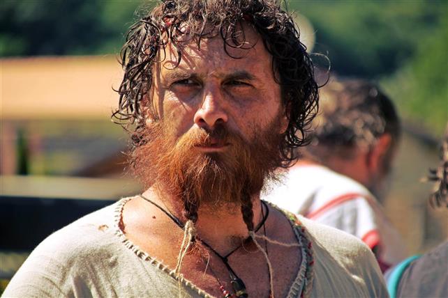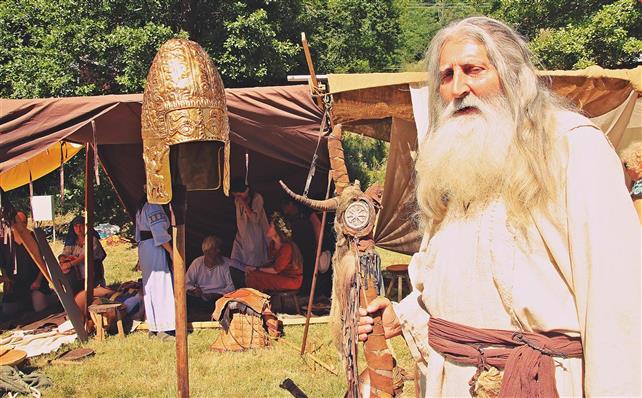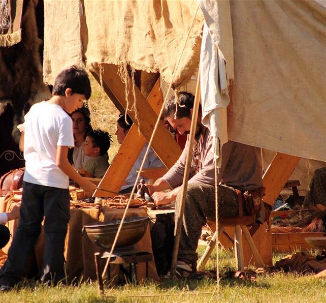 La umbra unui cort, un tânăr trebăluieşte de zor şi o mulţime de oamenii se opresc şi privesc uimiţi cum metalul, pielea sau osul prind forme antice de arme sau podoabe.