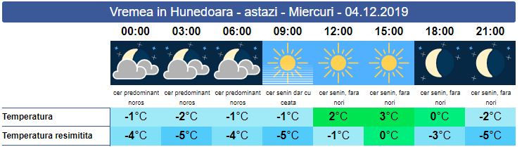 Astăzi, vremea este frumoasă. Dimineață ceața va persista în zonele de deal și munte până spre orele amiezii. Pe tot timpul zilei soarele va sta pe cer. Temperaturile maxime nu vor depăși 3 grade, dar le vom resimți mai scăzute.