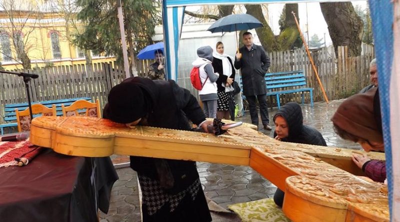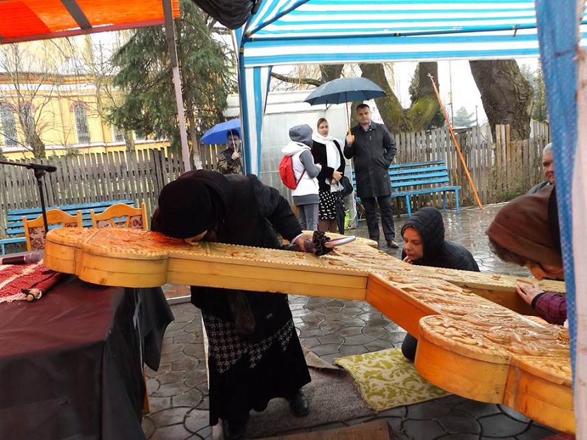 Crucea purtată de pelerini pe umeri rămâne apoi să străjuiască altarul schitului din stațiunea montană Straja.