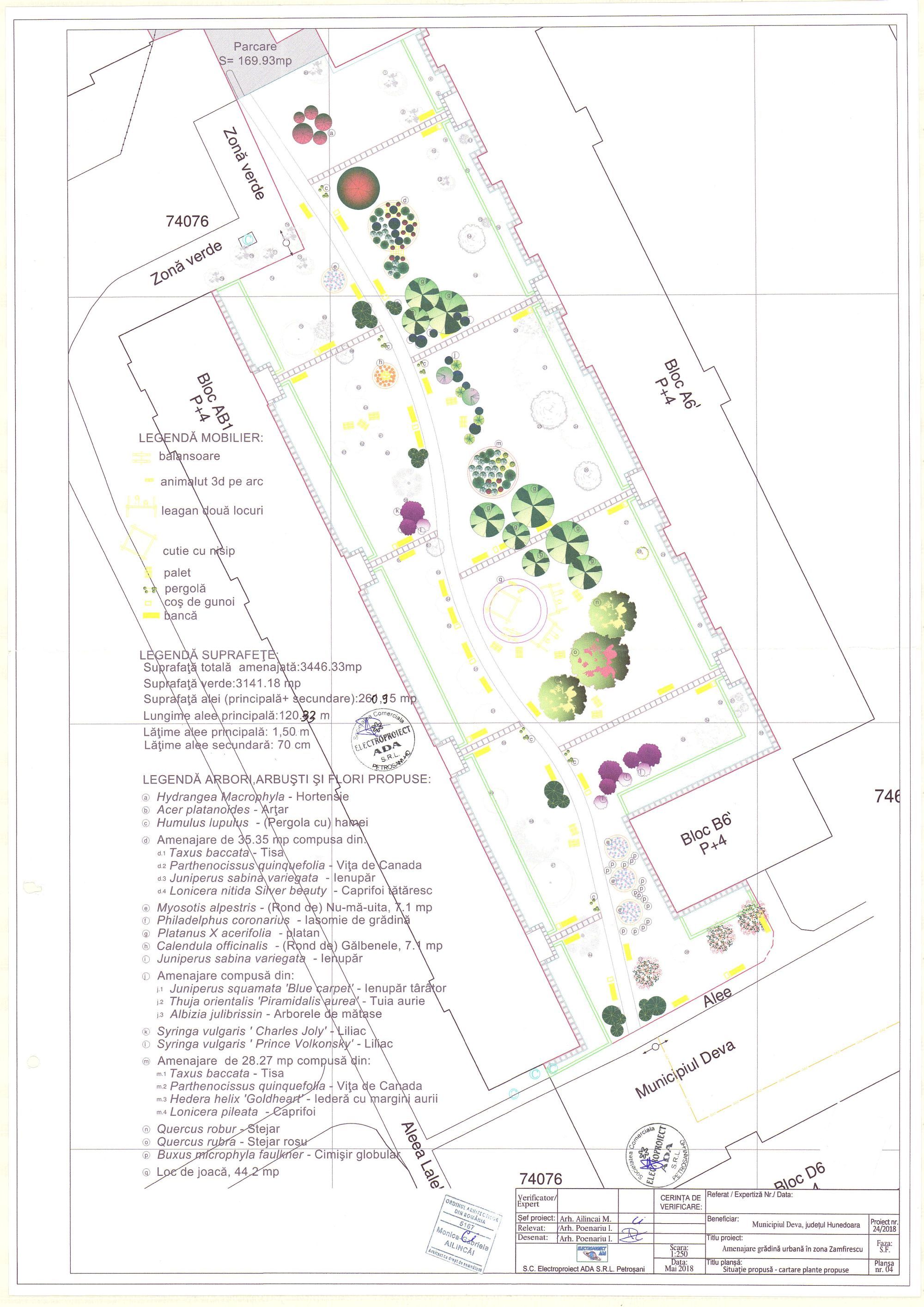 Primarul Municipiului Deva, Nicolae-Florin Oancea, a semnat marți, 16 iulie 2019, cu ADR Vest contractul de finanțare pentru proiectul ”Amenajare grădină urbană în zona Zamfirescu”, în valoare totală de 904,328.48 lei, inclusiv TVA (echivalentul a 197.693,36 euro), dintre care 800,155.36 lei (174.920,29 euro) – valoarea asistenței nerambursabile solicitate, iar 104.173,12 lei (22.773,07 euro) – valoarea cofinanțării Municipiului Deva.