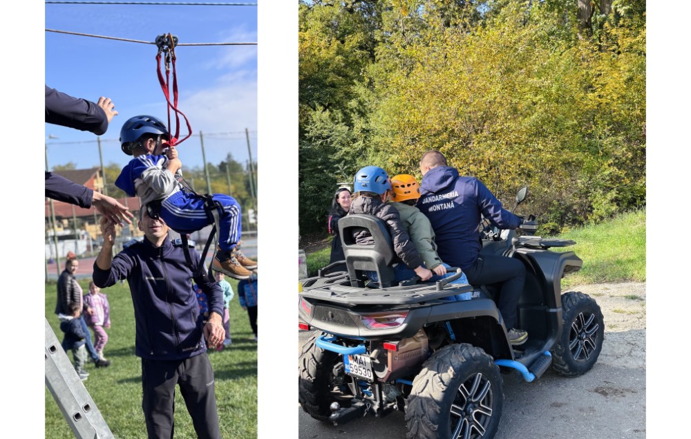 Alături de cadre didactice și părinți, preșcolarii au descoperit o parte din materialele și autospecialele din dotarea jandarmeriei, s-au bucurat de scurte plimbări cu ATV-ul, de tiroliana special amenajată de jandarmii montani pentru ei și au făcut cunoștință cu cel mai jucăuș și prietenos partener patruped din echipa jandarmilor.