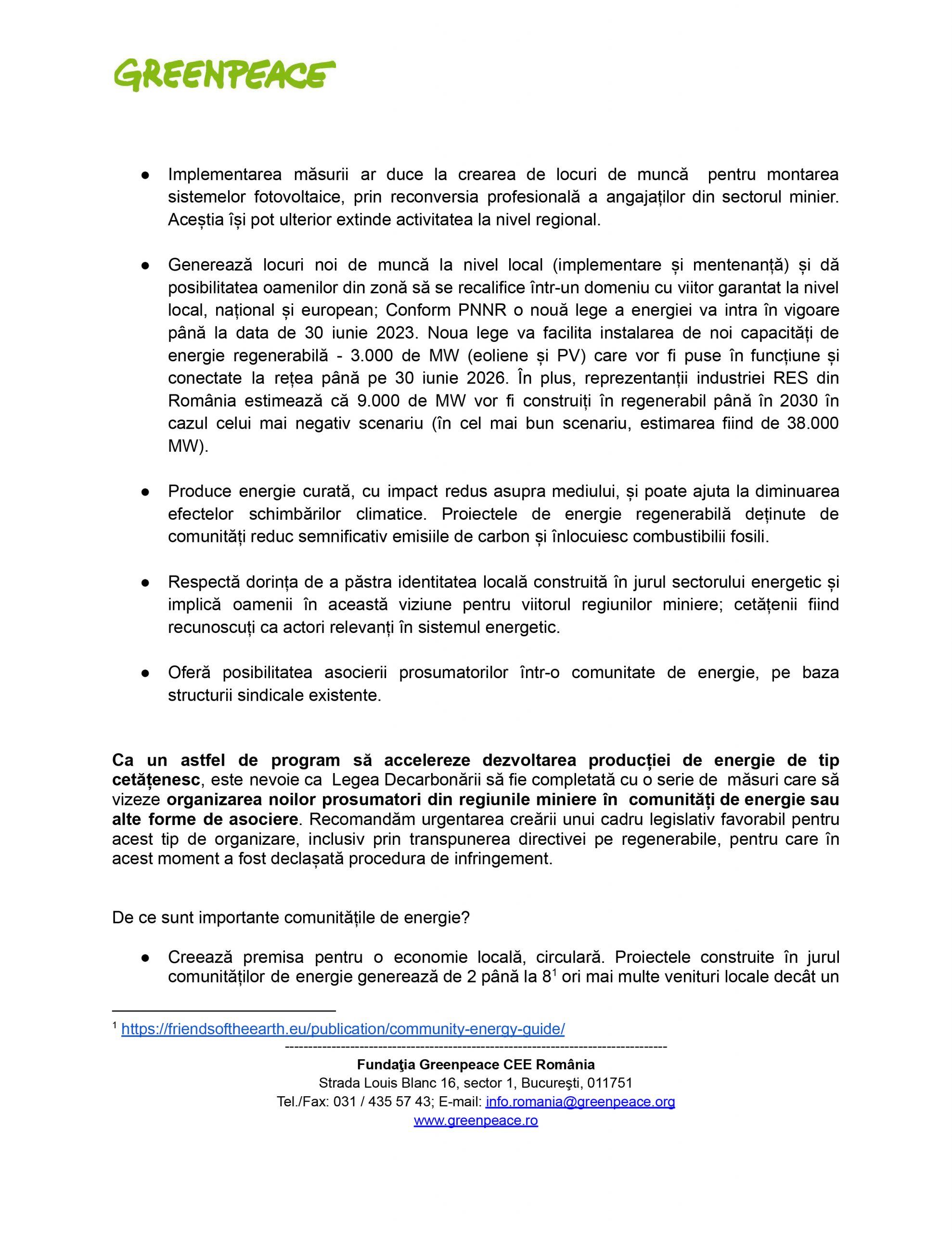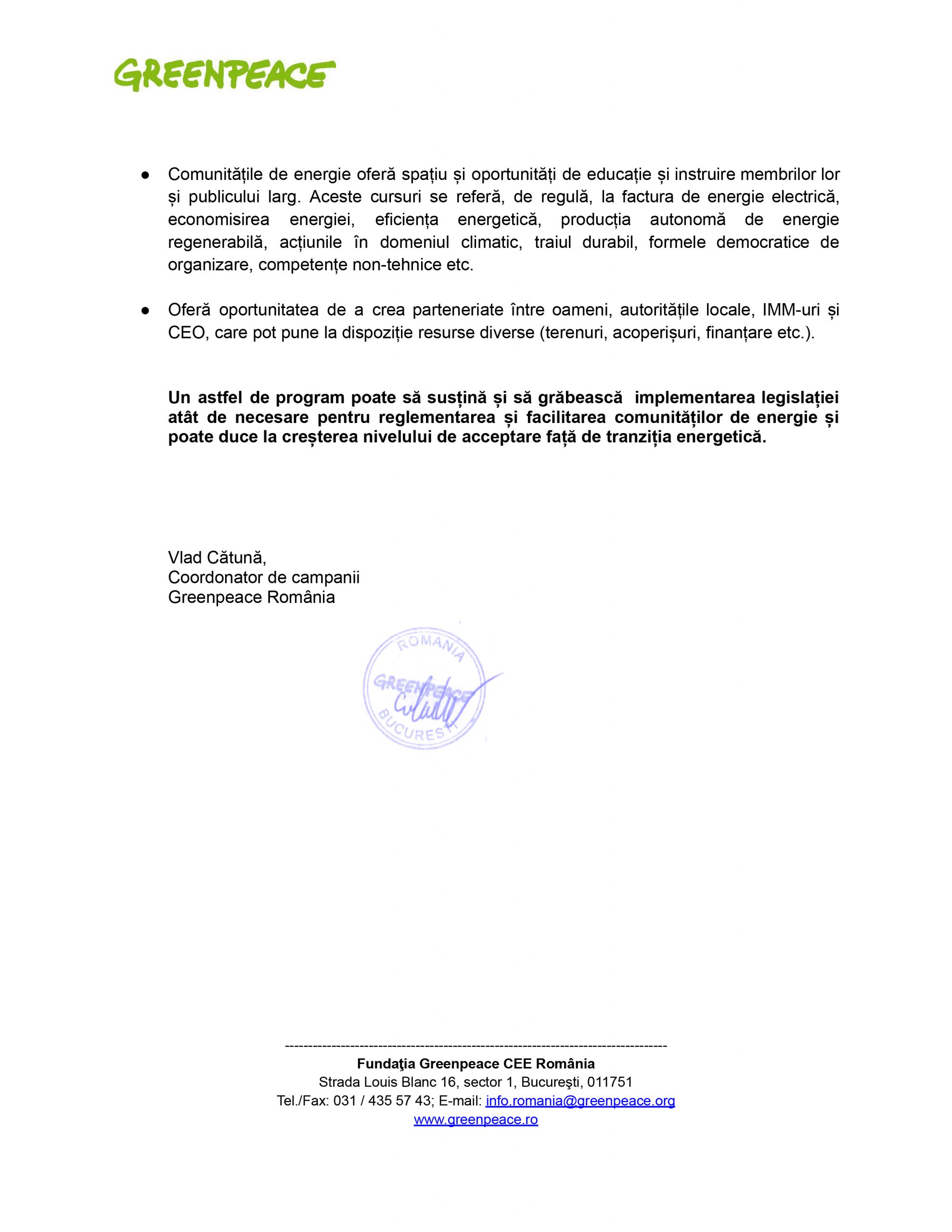 Greenpeace România a trimis o adresă Ministerului Energiei referitoare la poziția față de proiectul de ordonanță de urgență privind decarbonizarea sectorului energetic publicat în data de 31 mai 2022, pe site-ul ministerului.