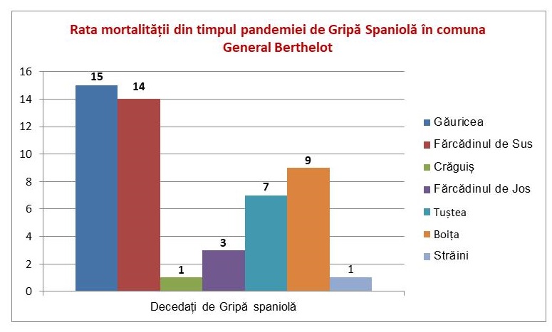 Ultima persoană decedată de Gripă Spaniolă, în satele comunei General Berthelot, a fost înregistrată, în ziua de 14 februarie 1919, la Fărcădinul de Sus, ceea ce susține ipoteza potrivit căreia epidemia s-ar fi stins, pe plan local, în partea a doua a acestei luni.
