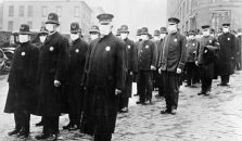 Polițiști americani cu măști de tifon, în timpul Gripei Spaniole
