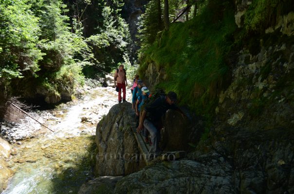 Se aude din ce în ce mai tare un zgomot puternic de apă. Trebuie să trecem un podeț îngust. Înaintea coloanei, trece Alexandra care știe exact traseul și ce trebuie să facă. La prima vedere pare cam dificil. Fiecare copil e ajutat să treacă podețul. Am trecut de primul hop.