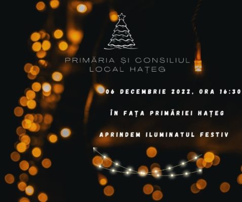 „Dragi hațegani, Primăria și Consiliul Local Hațeg vă invită mâine, 06 Decembrie 2022, în fața Primăriei orașului Hațeg, de la ora 16:30, la aprinderea iluminatului festiv! Așteptăm copiii însoțiți de părinți pentru a ne bucura împreună de micile bucurii ce ne aduc mai aproape de magia sărbătorilor de iarnă. Astfel se vor aprinde luminile de Crăciun iar apoi un spectacol realizat de colindătorii orașului Hațeg. Vă așteptăm cu drag să trăim împreună momentul în care orașul nostru primește lumină pentru Sfintele Sărbători!”, arată autoritățile locale ale orașului Hațeg.
