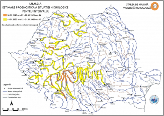 Astfel, este cod galben, în intervalul 18.01.2023 ora 12:00 – 21.01.2023 ora 12:00, pe râurile din bazinele hidrografice: Tisa – sector aferent S.H. Valea Vişeului, Vişeu, Iza, Lăpuş (judeţul Maramureş), Tur (judeţul Satu Mare), Someşul Mare – bazin superior şi afluenţi bazin mijlociu şi inferior (judeţul Bistriţa Năsăud), Someşul Mic – bazin amonte S.H. Apahida (judeţele: Bihor şi Cluj), Crişul Repede – bazin superior şi afluenţi bazin mijlociu şi inferior (judeţele: Cluj şi Bihor), Crişul Negru – bazin superior şi afluenţi bazin mijlociu şi inferior (judeţele: Bihor şi Arad), Crişul Alb – bazin amonte S.H. Gurahonţ şi afluenţii aferenţi sectorului aval S.H. Gurahonţ (judeţele: Hunedoara şi Arad), Arieş (judeţele: Alba şi Cluj), Mureş – afluenţii aferenţi sectorului aval confluenţă cu râul Târnava (judeţele: Alba, Sibiu, Hunedoara şi Arad), Bega – bazin amonte S.H. Balinţ (judeţul Timiş), Timiş – bazin amonte S.H. Sadova şi afluenţii aferenţi sectorului aval S.H. Sadova – amonte S.H. Lugoj (judeţele: Caraş Severin şi Timiş), Bârzava – bazin amonte S.H. Moniom şi afluenţii aferenţi sectorului aval S.H. Moniom – amonte S.H. Gătaia, Caraş, Nera (judeţul Caraş Severin), Cerna (judeţele: Gorj şi Caraş Severin), Jiu – bazin amonte S.H. Podari (judeţele: Hunedoara, Gorj, Mehedinţi şi Dolj), Olt – afluenţii de stânga aferenţi sectorului aval S.H. Hoghiz – amonte S.H. Sebeş Olt, Bârsa – afluent al Oltului (judeţele: Braşov şi Sibiu), Olt – afluenţii aferenţi sectorului aval S.H. Sebeş Olt – amonte Ac.Ioneşti (judeţele: Sibiu, Vâlcea şi Argeş), Olteţ (judeţele: Gorj, Vâlcea şi Olt), Argeş – bazin superior, Dâmboviţa – bazin superior (judeţele: Argeş şi Dâmboviţa), Ialomiţa – bazin amonte S.H. Pucioasa şi afluenţii aferenţi sectorului aval S.H. Pucioasa – amonte S.H. Siliştea Snagovului (judeţele: Dâmbovita, Prahova şi Ilfov), Prahova – bazin superior, Teleajen (judeţul Prahova).