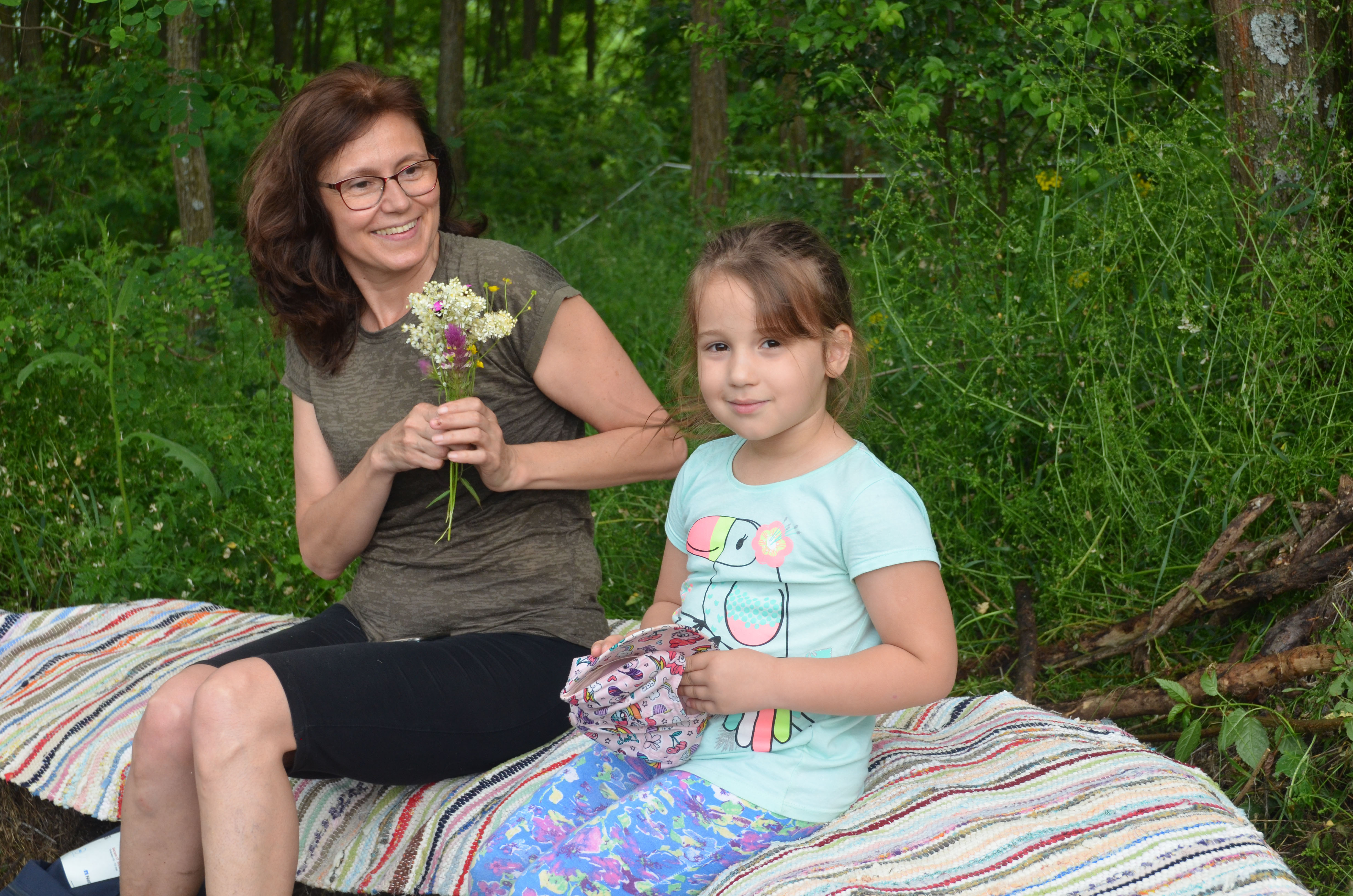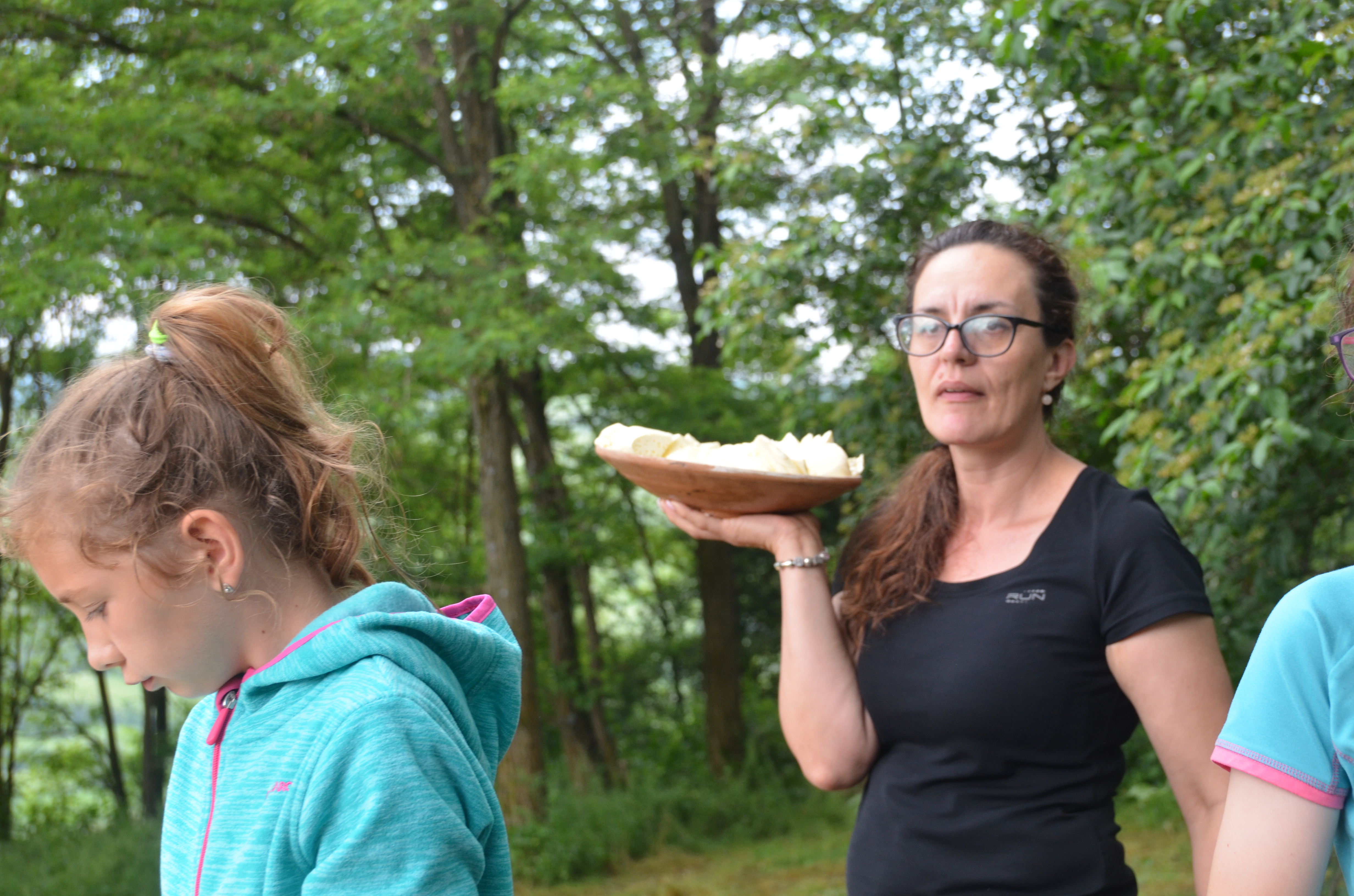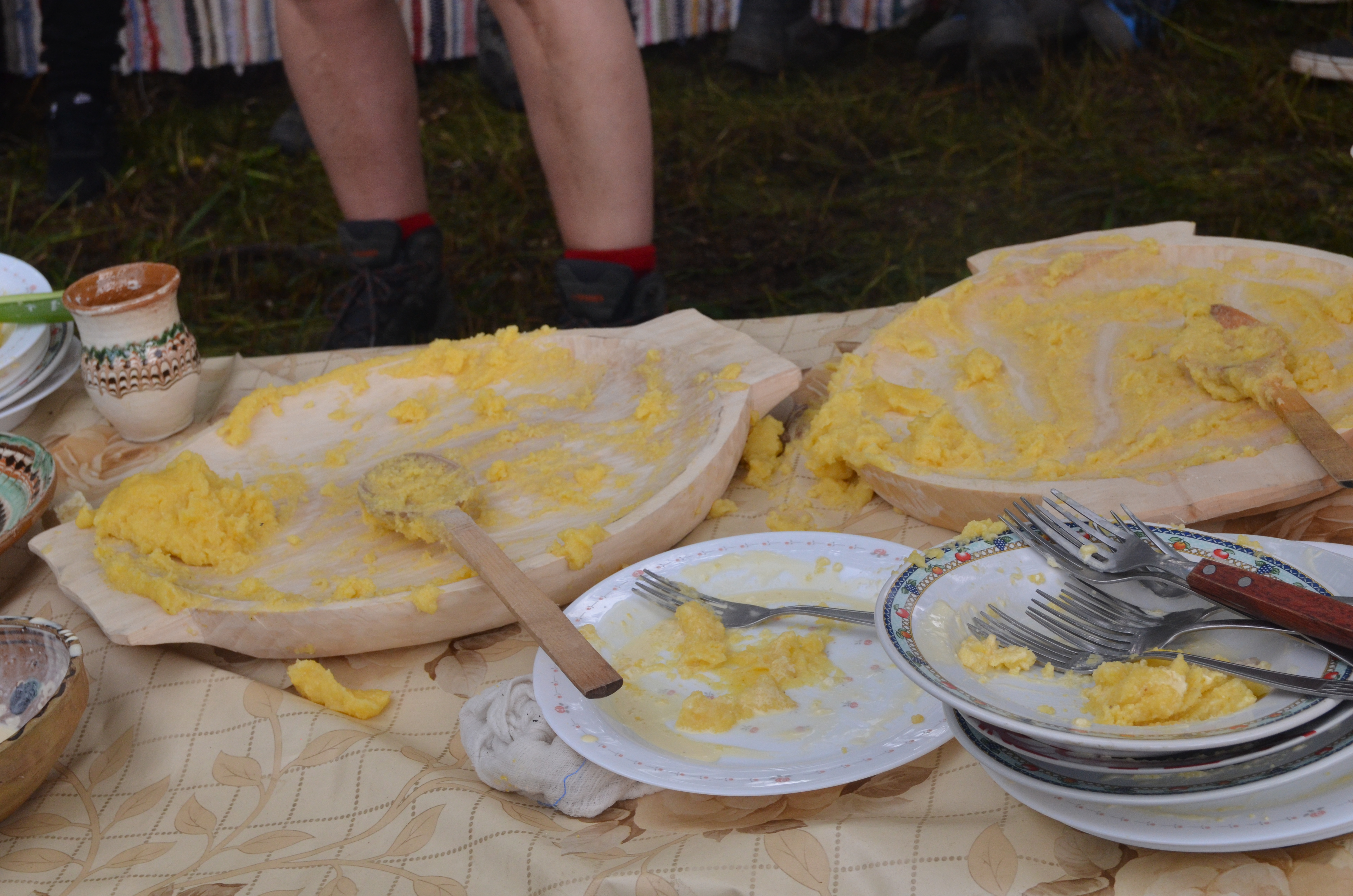 Și printre poveștile gazdei despre proiectele de viitor, admirația noastră și jocul copiilor, acolo desupra dealurilor în mireasma fânului proaspăt cosit, pe două șiruri de baloți care serveau în loc mese și scaune, Alin intinde imediat un preș țărănesc, în loc de cuvertură, iar dna Dora apare cu două castroane mari cu brânză. Se aduc și două platouri de lemn cu mămăligă fierbinte, ceapă verde, slăninuță, două boluri din ceramică pline de smântână, băutura de sezon -socată în două bidoane mari. Toate de la mama lor de acasă. Până și ceșcuțele pentru băut erau din lut.