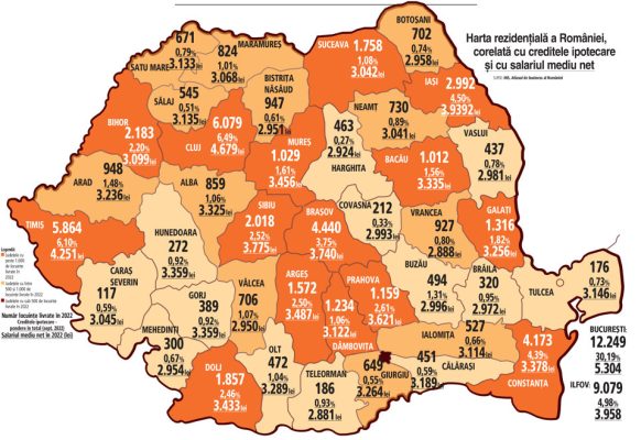 O hartă recent publicată de Ziarul Financiar, care corelează numărul creditelor ipotecare cu salariul mediu net la nivel de județ, scoate la iveală disparități semnificative în România. Deși județul Hunedoara are o rată a creditării de 0,92%, inferioară mediei naționale, o analiză a datelor arată o situație complexă, plasându-l într-o poziție de mijloc, departe de polii de creștere, dar și de zonele cu o putere de cumpărare extrem de redusă.