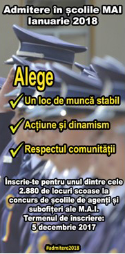 În perioada 13 – 21 ianuarie 2018, instituţiile de învăţământ postliceal ale M.A.I. vor organiza concurs de admitere pentru o nouă promoție de elevi. Durata studiilor, de această dată, este de 1 an.