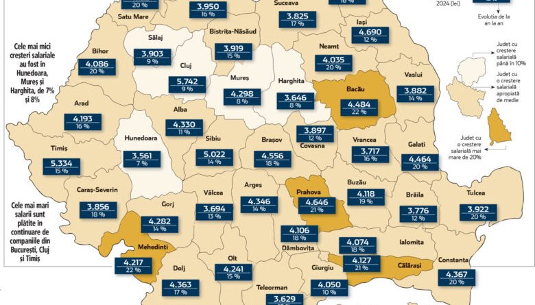 Conform datelor de la Institutul Național de Statistică (INS) și calculelor realizate de Ziarul Financiar, 10 județe au înregistrat creșteri salariale de peste 20% în ultimul an, în timp ce cinci județe au avut creșteri sub 10%. Aceasta evidențiază o tendință de majorare a salariilor în județele cu venituri inițial mai mici, cum este cazul Bacăului, Mehedințiului și Călărașiului.