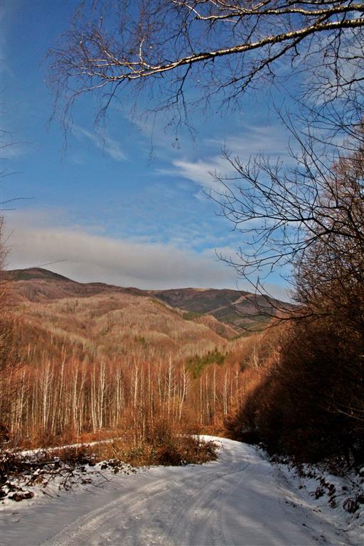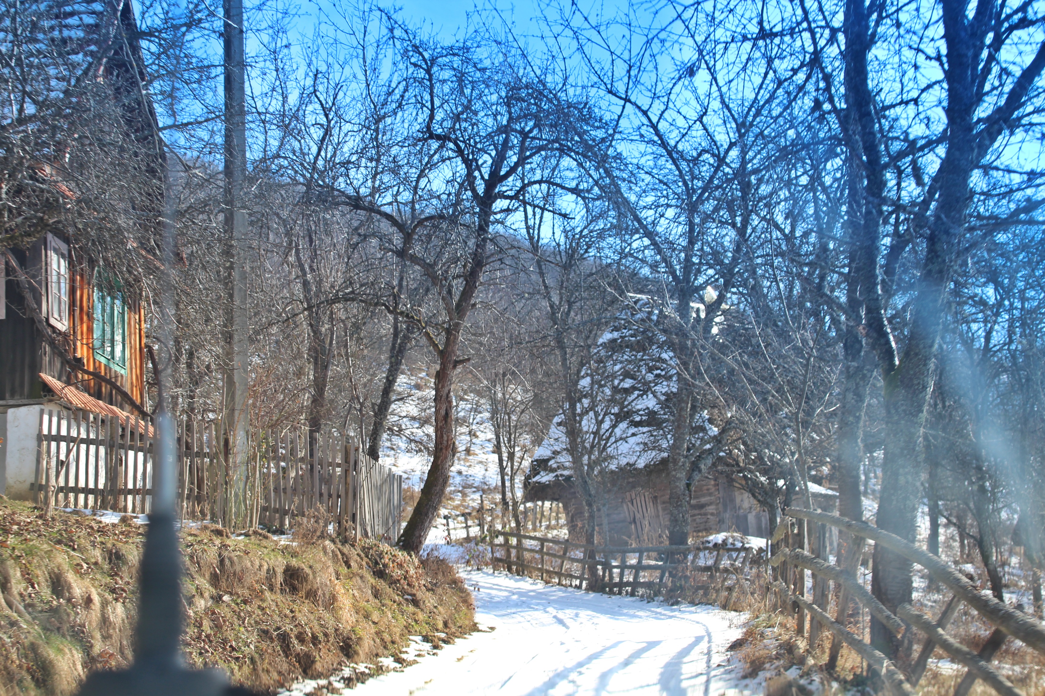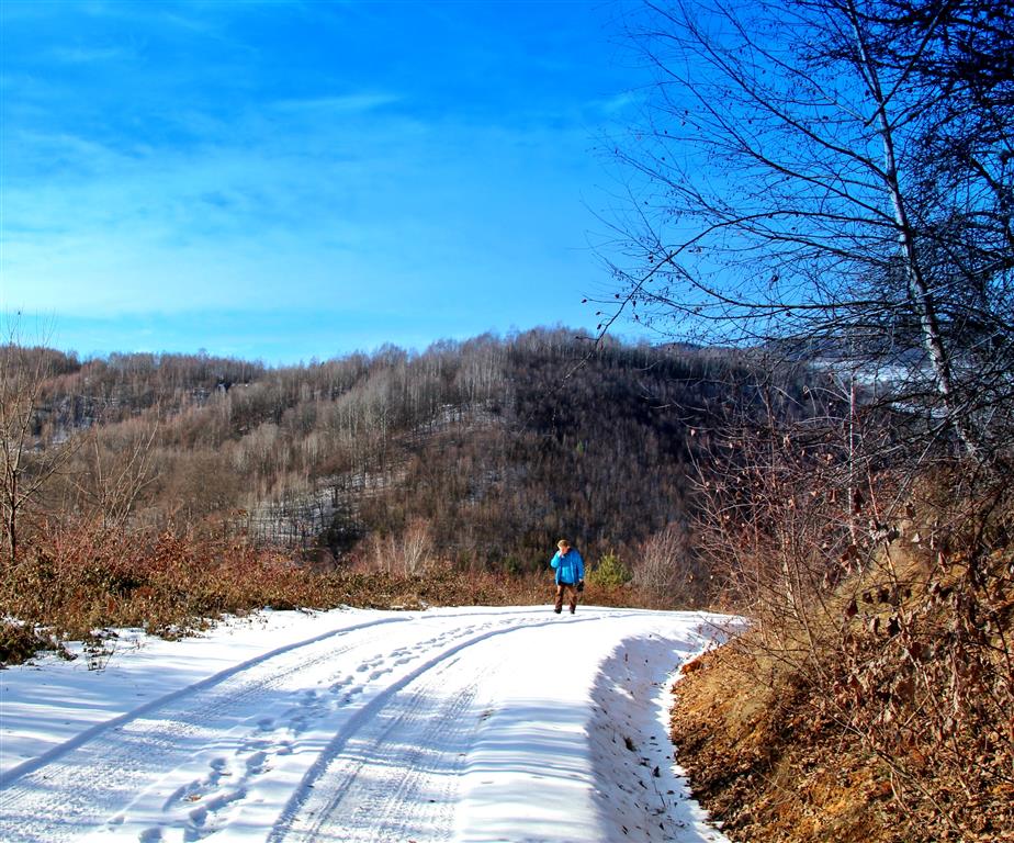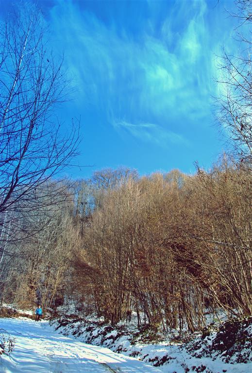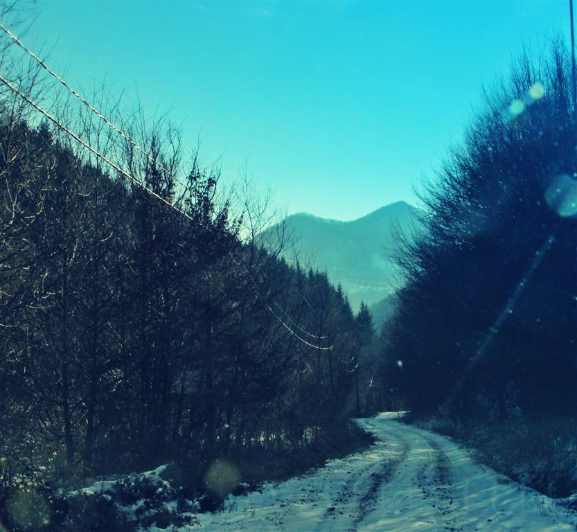 Drumul e învelit cu zăpadă şi maşinile răzbat greu chiar dacă sunt 4×4 şi au cauciucuri de iarnă. Deasupra un cer albastru îşi întinde seninul peste lume şi dâre uşoare de nori par a fi lăsate de o pensulă măiastră.