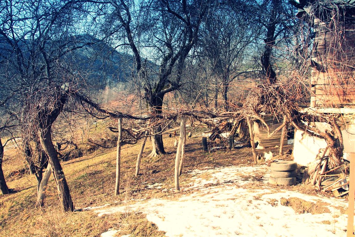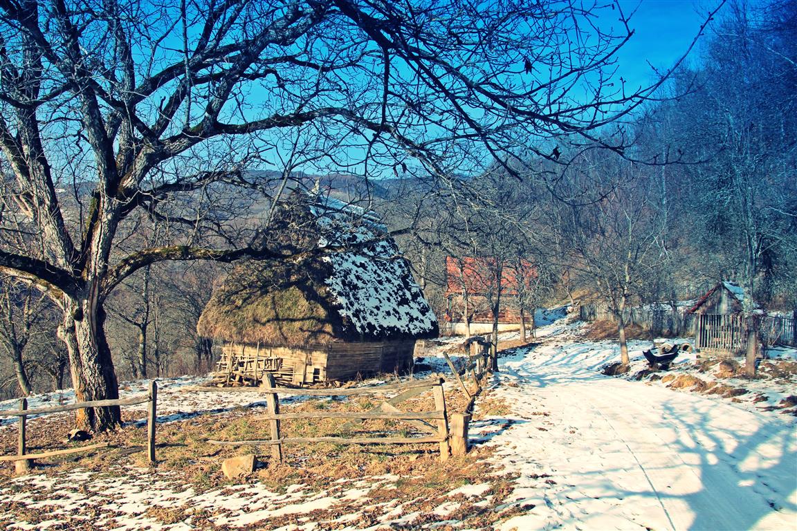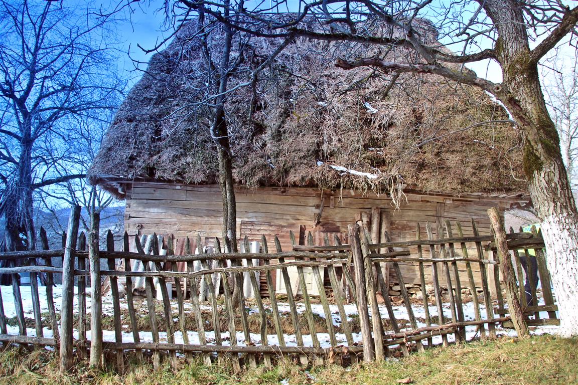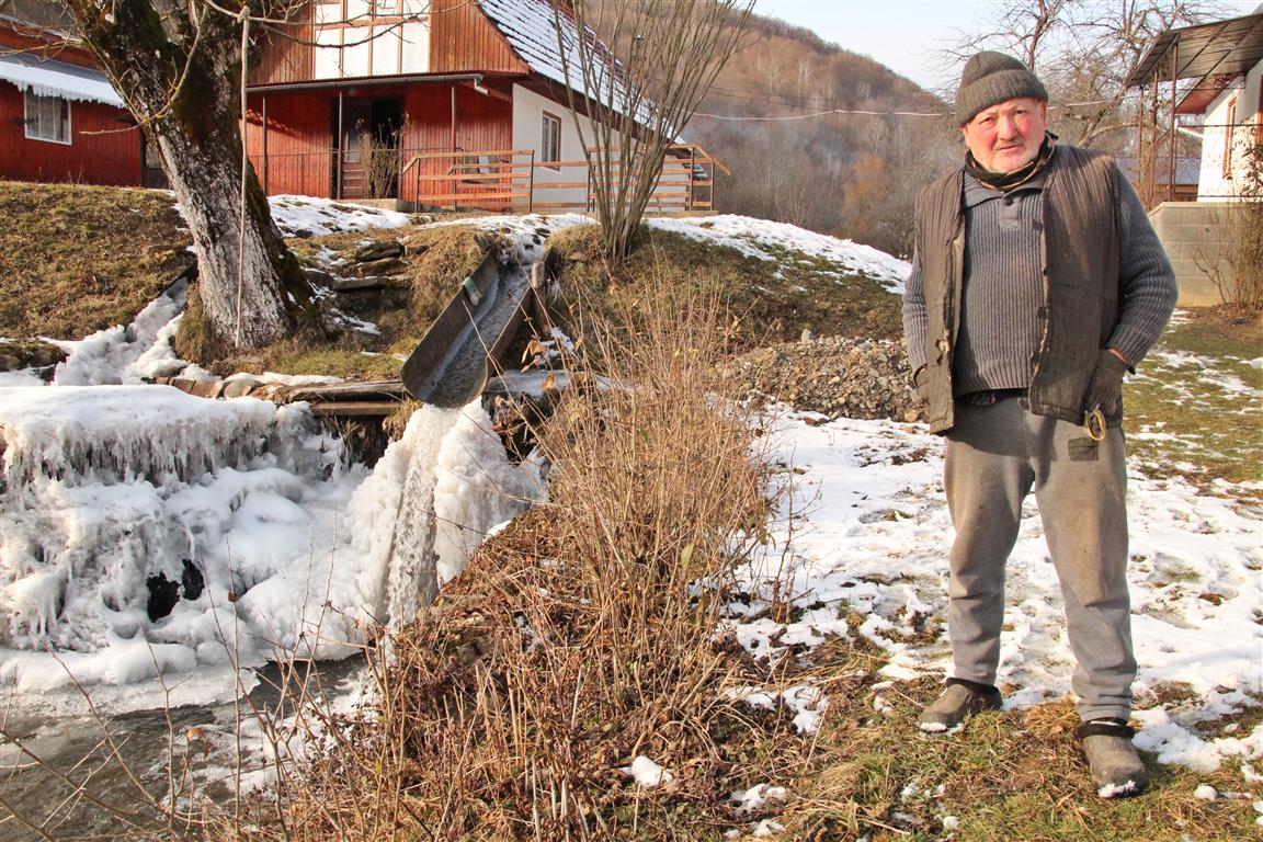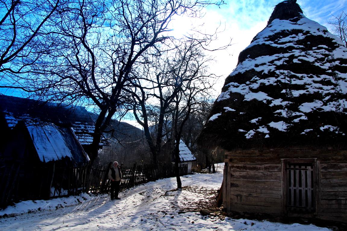 Gardurile dezordonate de lemn te conduc către un pâlc de case. Nea Viorel iese la poartă curios – nu în fiecare zi ajung maşini pe drumul satului. E singur de câţiva ani, de când soţia i-a murit după ce a căzut de pe o claie de fân. „Ooo, Doamne!” icneşte moţul strecurându-se pe lângă peretele de lemn al casei. Merge atent pe o potecă îngheţată, nu care cumva să lunece şi să-şi facă necaz în plină iarnă. La colţul casei, un butoi de tablă stă sprijin pentru un retevei zdravăn.