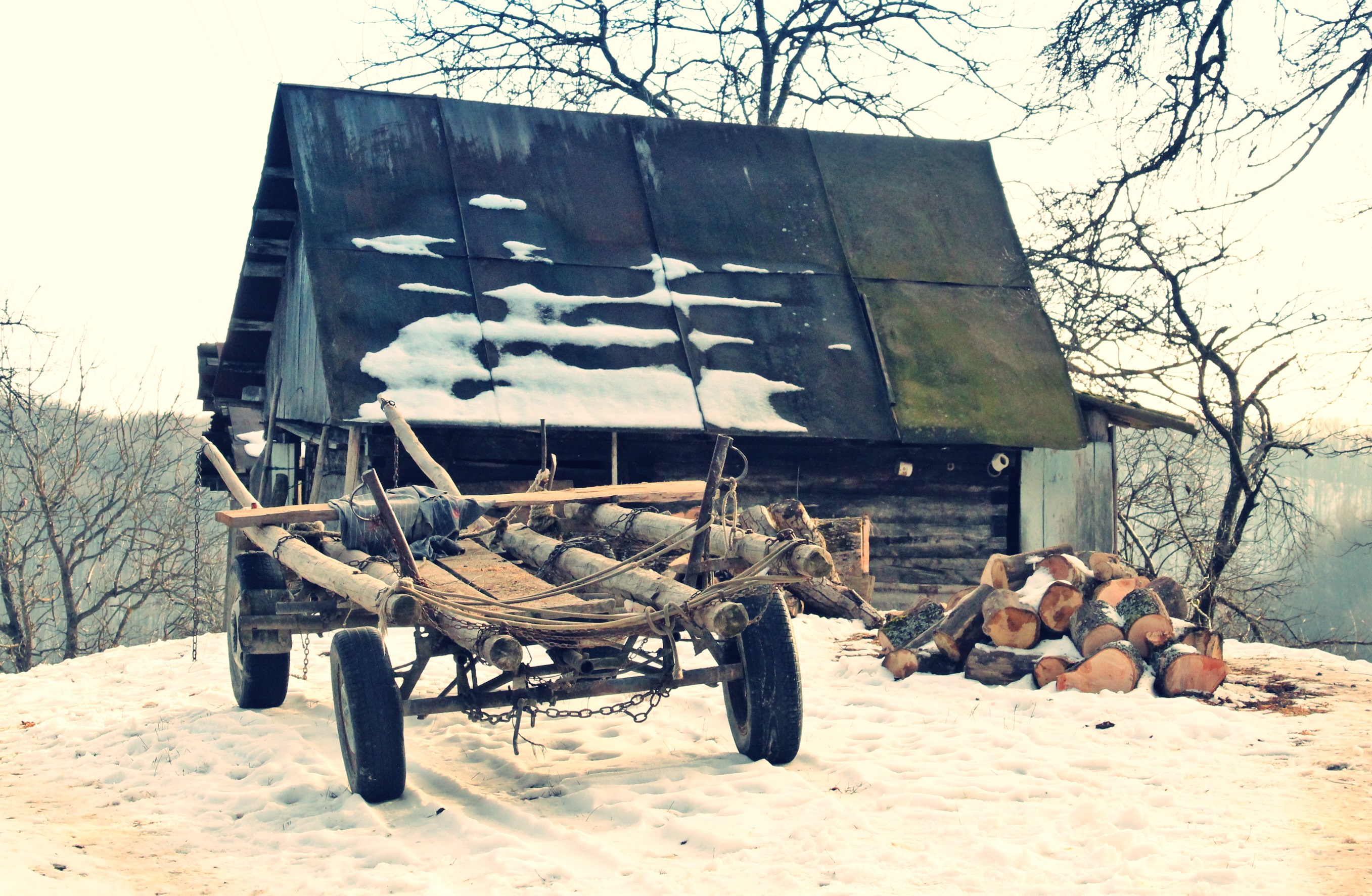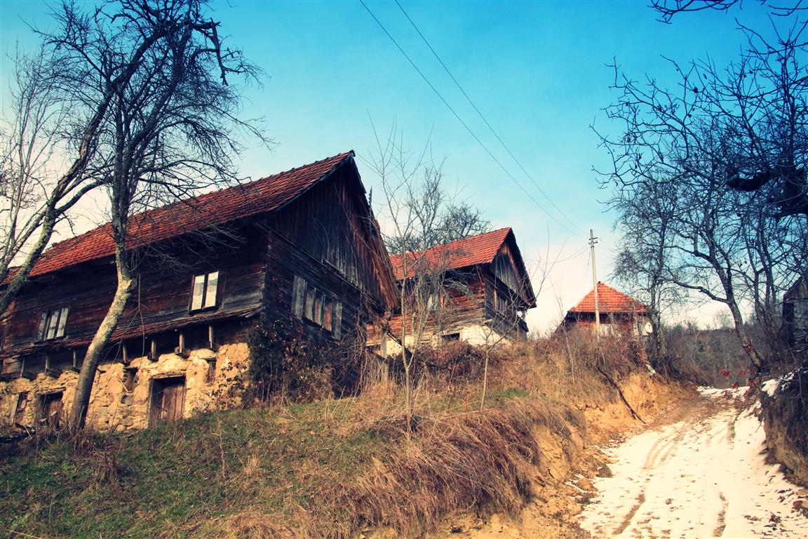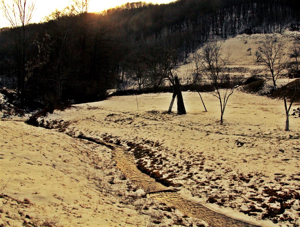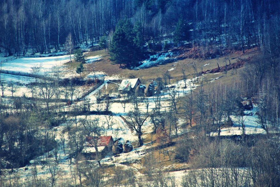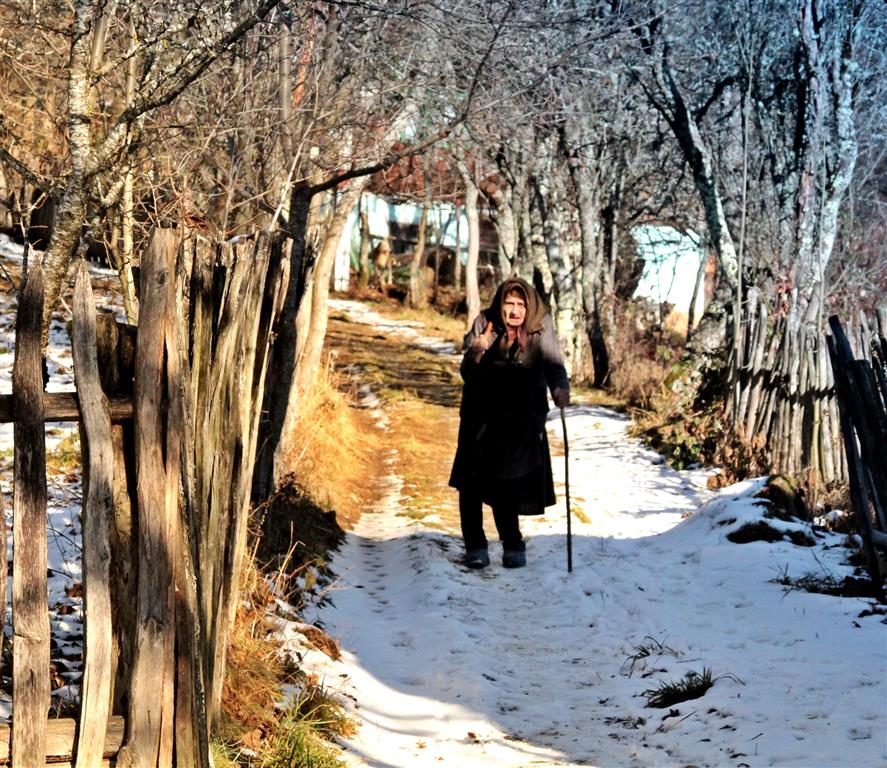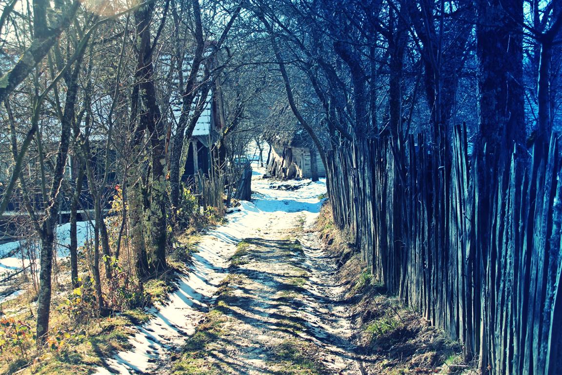 Gardurile dezordonate de lemn te conduc către un pâlc de case. Nea Viorel iese la poartă curios – nu în fiecare zi ajung maşini pe drumul satului. E singur de câţiva ani, de când soţia i-a murit după ce a căzut de pe o claie de fân. „Ooo, Doamne!” icneşte moţul strecurându-se pe lângă peretele de lemn al casei. Merge atent pe o potecă îngheţată, nu care cumva să lunece şi să-şi facă necaz în plină iarnă. La colţul casei, un butoi de tablă stă sprijin pentru un retevei zdravăn.