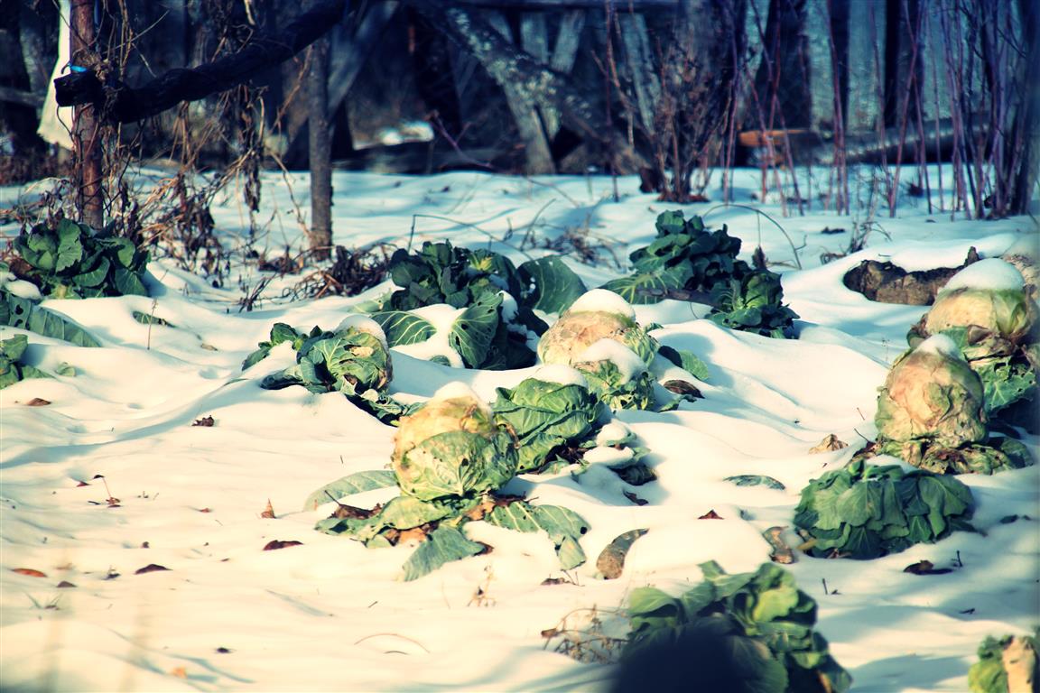 Ciulini rotaţi coboară din gura pădurii până în drum ca nişte soldaţi gata să se zburlească la străinii care le strică meleagul. Sus, într-o grădină, verzele au cuşme de zăpadă şi veşmânt tivit cu frunze verzi.
