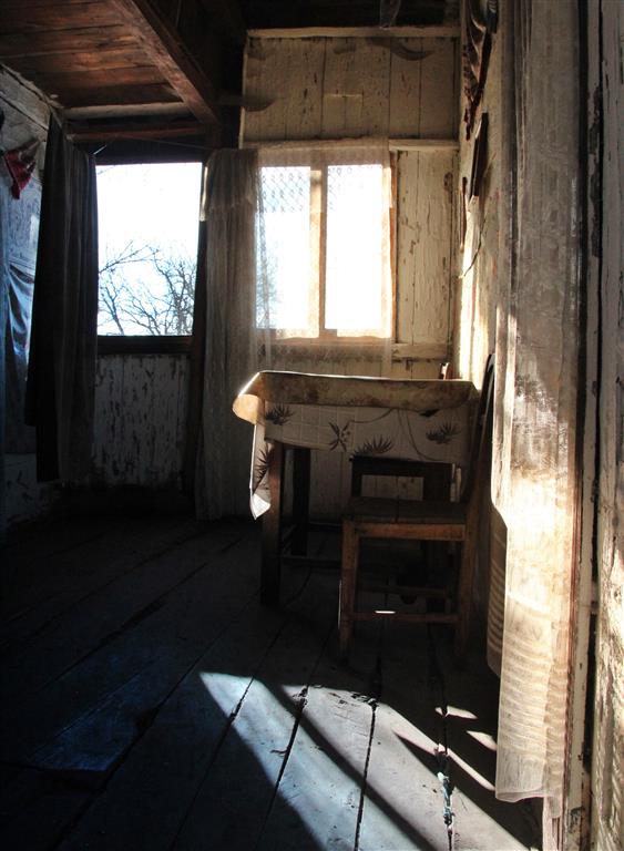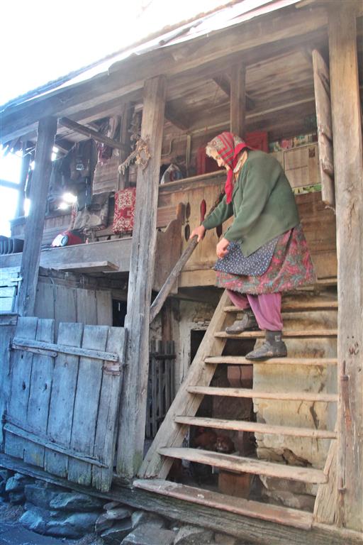 În faţă, o scară trainică, dar abruptă din lemn te duce direct la pridvorul de la etaj unde sunt camerele de locuit „Bunicul soţului meu a fost primar aici şi el a ridicat-o aşa. Erau tare mândri de ea. Îmbătrâneşte şi ea odată cu noi”, se întristează femeia cu privirea la acoperişul de pe care se desprind ţiglele.