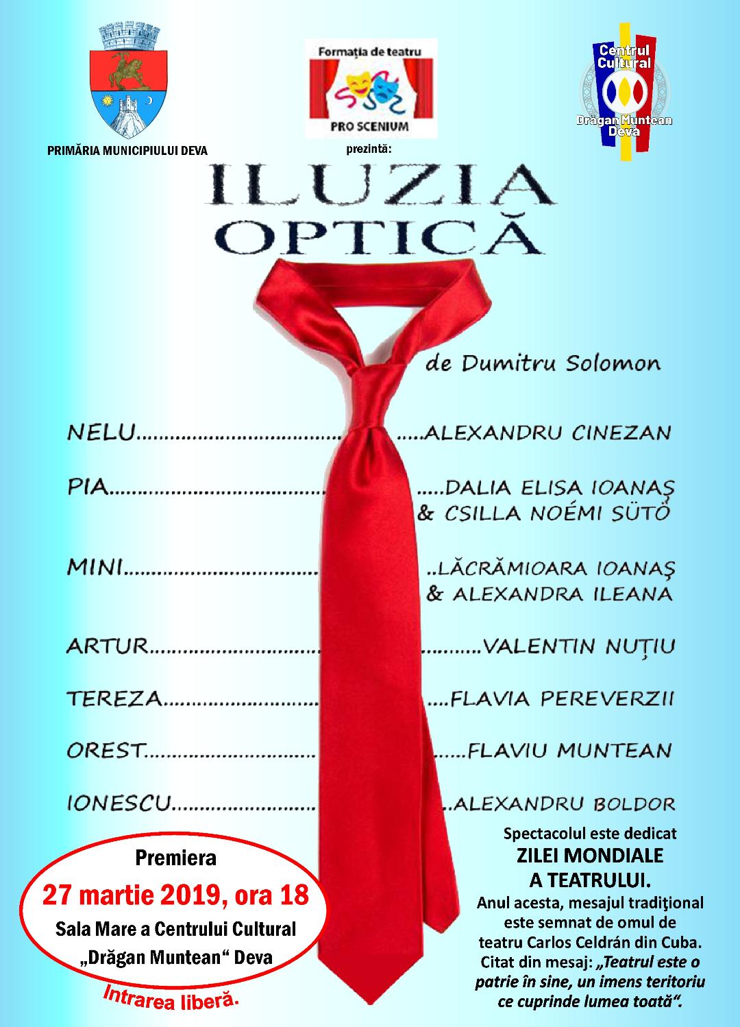 Centrul Cultural ”Drăgan Muntean” din Deva sărbătorește Ziua Mondială a Teatrului cu o comedie – ”Iluzia optică”, a dramaturgului Dumitru Solomon, în regia lui Mihai Lungeanu.