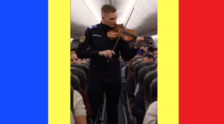 Un jandarm român a interpretat Imnul Național la vioară în timpul unui zbor TAROM, la peste 10.000 de metri altitudine. Momentul a fost surprins într-un videoclip publicat de Jandarmeria Română, în ajunul Zilei Naționale.