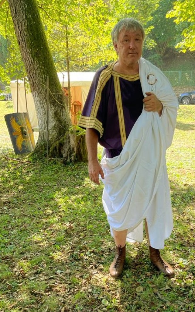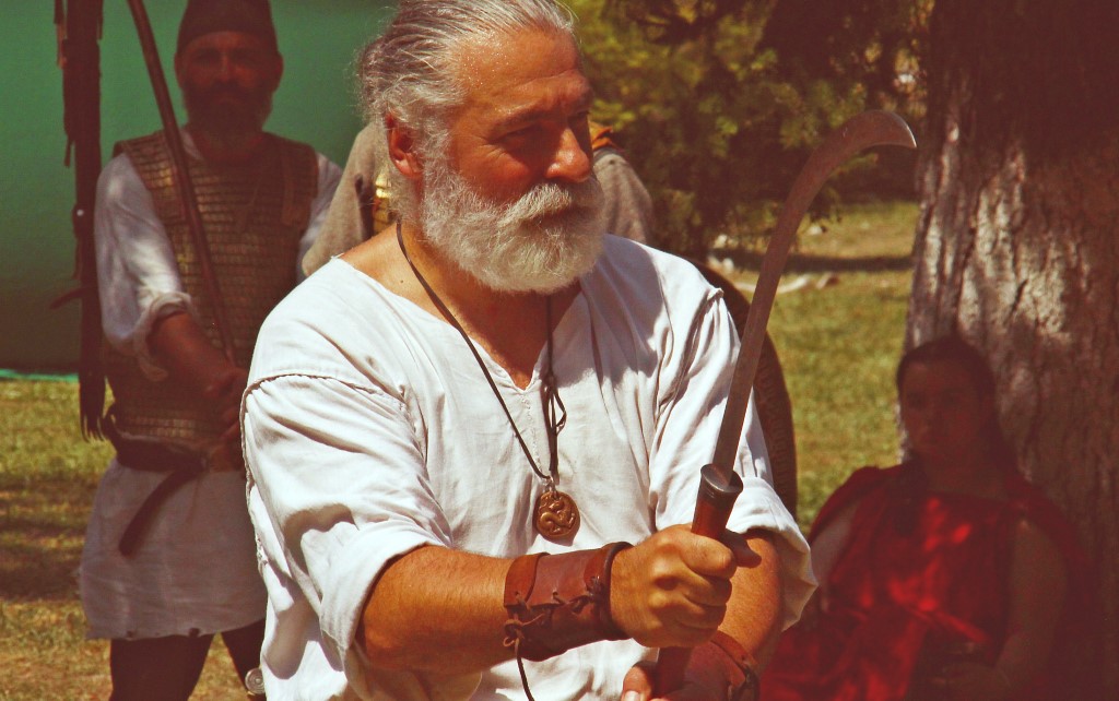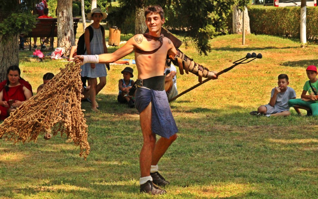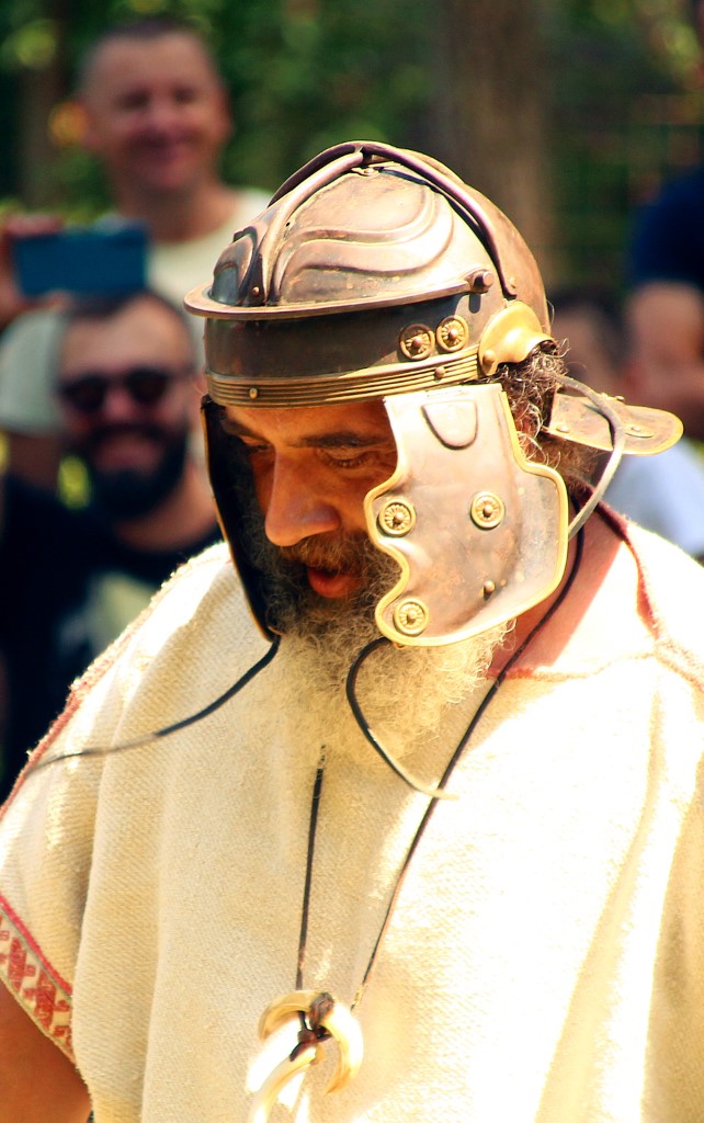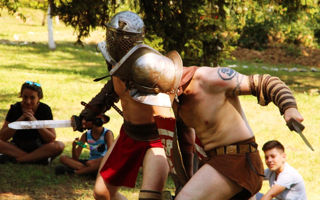 Numele lui înseamnă foarfecă”, explică, printre aplauze, Paul Cheptea, fostul preşedinte al Asociaţiei Terra Dacica Aeterna. Actualul şef al reenactorilor, Lucian Panov, joacă excelent rolul de stăpân al sclavilor. Ca să îşi supravegheze luptătorii şi să le dea indicaţii, se amestecă printre spectatori şi, spre uimirea acestora, începe să facă tot felul de gesturi semn că, fie eşti dac, fie roman, luptător sau stăpân, comunicarea non verbală e deosebit de folositoare.