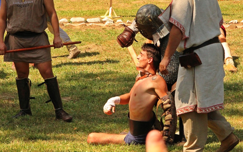 Chiar dacă e leoarcă de transpiraţie, gladiatorul scissor este nevătămat faţă de colegii lui zgâriaţi, loviţi şi răniţi. Pumnii le sângerează, iar spatele unuia este plin de iarbă mărunţită. Simularea luptelor antice este departe de a fi o joacă, mai ales când tinerii se lasă cuprinşi de valurile de adrenalină.