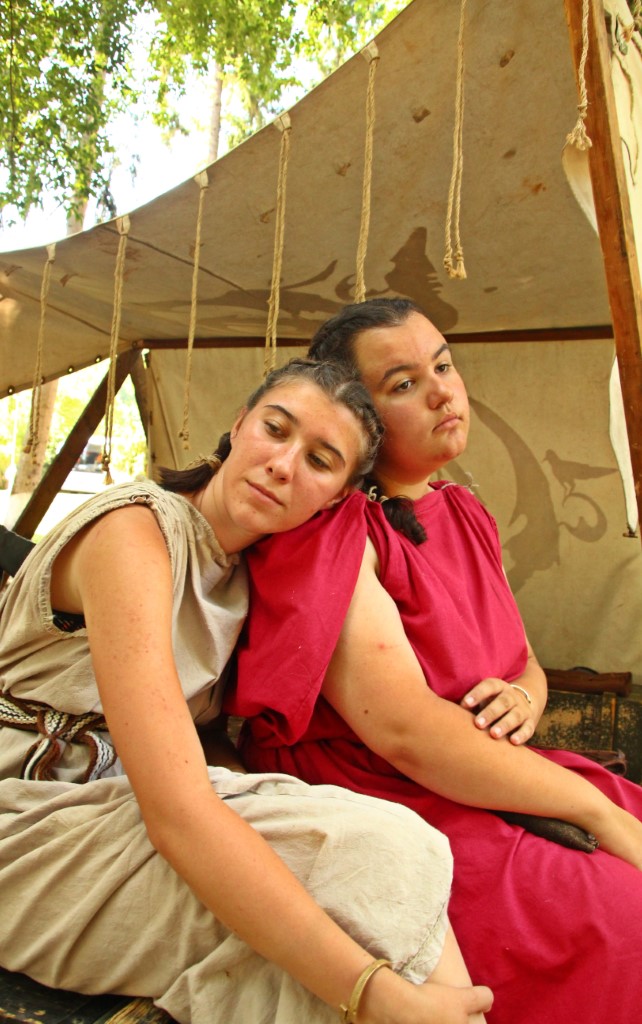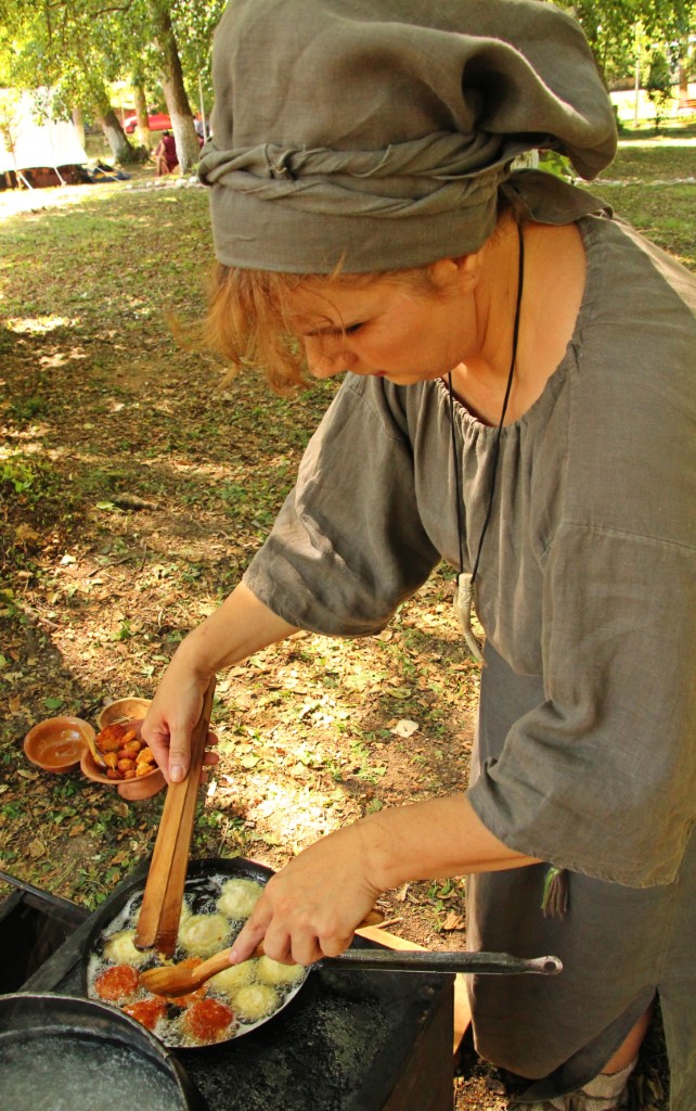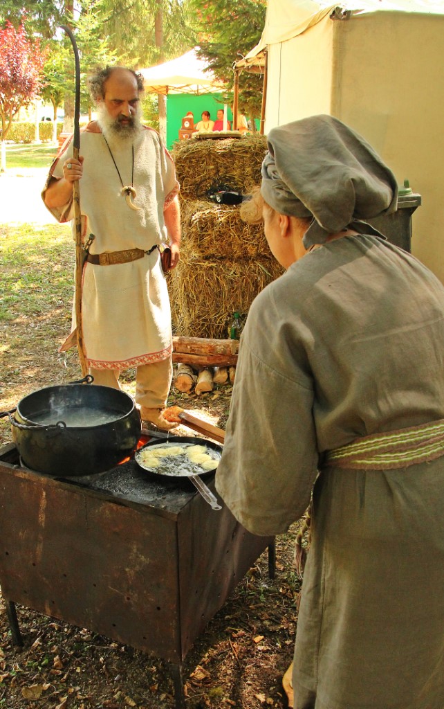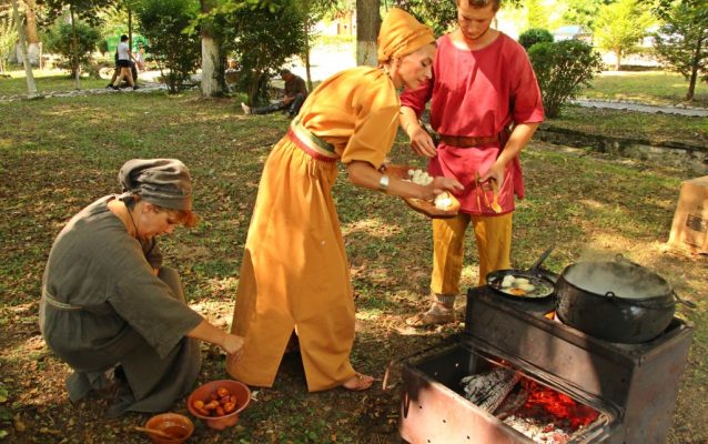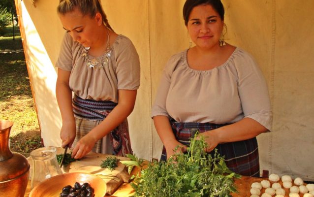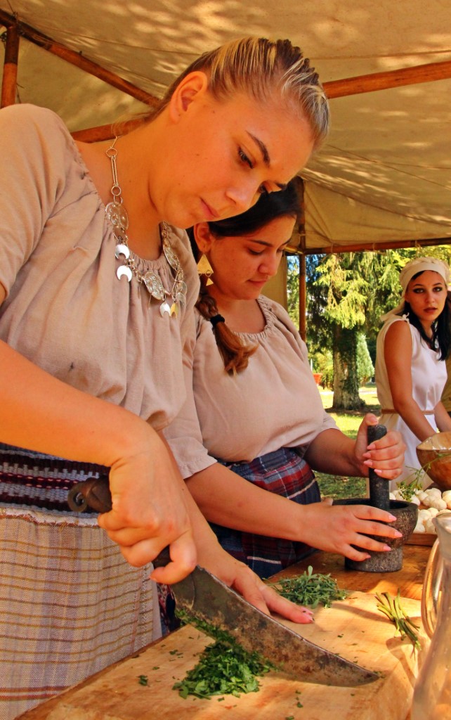 Din zona bucătăriei, se strecoară arome cum numai la festivalurile antice poţi savura. Aici armele sunt scobitorile cu care vizitatorii capturează delicioasele măsline care înoată în miere, cuţite impresionante ale căror lame toacă verdeţuri, mojarul care zdrobeşte condimente şi pumnii dăciţelor care frământă de zor. „Pregătim amestecul pentru brânza moretum, adică pisăm coriandru, punem usturoi, pătrunjel tăiat mărunt şi rută, la care adăugăm ulei de măsline. Toate astea se amestecă apoi cu brânza. Se serveşte de obicei pe lipii, dar se poate şi pe pâine prăjită”, explică Ştefania Ursu, apoi completează: „E foarte bună! Era mâncarea legionarului, este rapid şi uşor de făcut.”