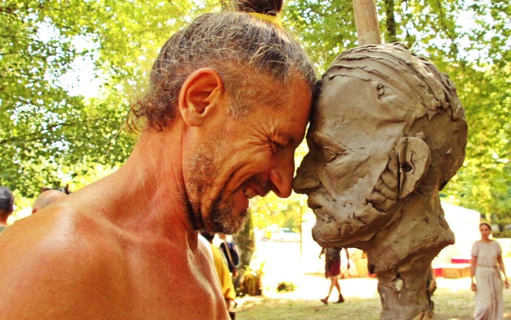 Un pas, doi mai încolo, pe un băţ înalt, artistul din tabăra dacilor modelează un chip de lut. Nu atât forma cenuşie atrage privirile, cât mişcările degetelor bărbatului care ba alintă pasta, ba o chinuie, ori o înconjoară cu palmele. Copleşit de zbucium, lutul pare un chip ţărănesc, apoi un filozof cu mustăţi şi barbă, după care totul întinereşte uimitor.