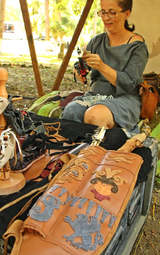 În altă parte a taberei, cei de la Terra Dacica Aeterna au montat atelierele. Angelica Bălos lucrează de zor cu acul. Pe lângă corturile unde femeile cos, ţes, deapănă, destramă şi iar împletesc, o construcţie de lemn atrage privirile. Este „strungul” unde Ciprian Pop îmblânzeşte lemnul.
