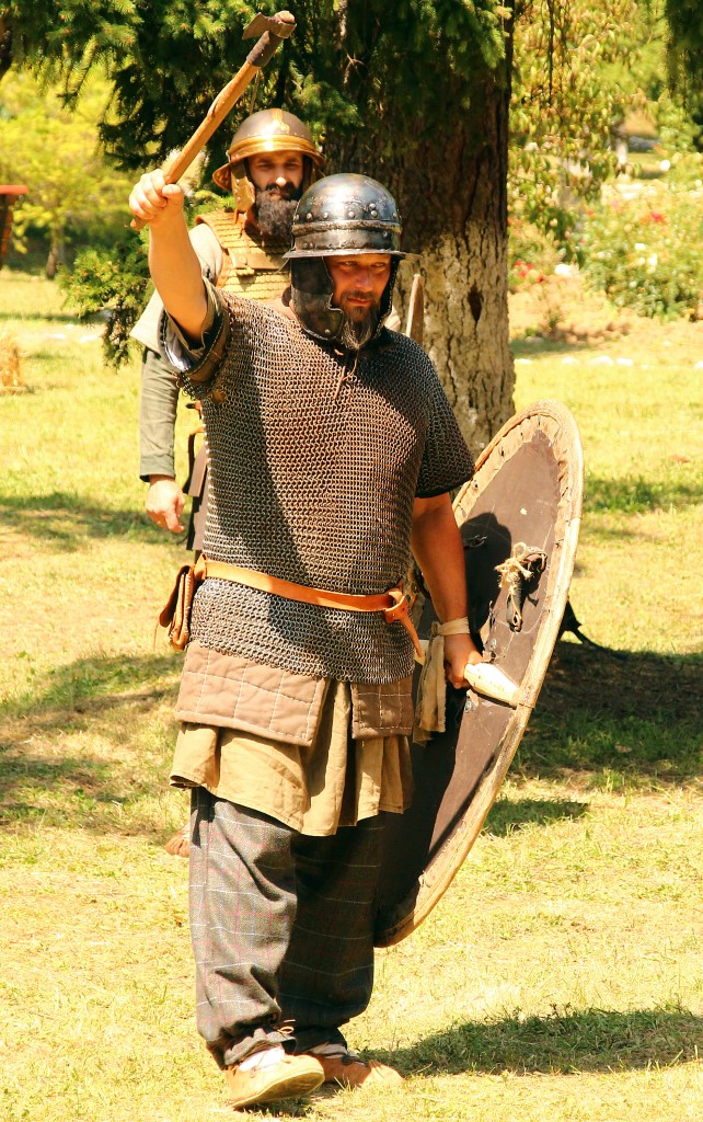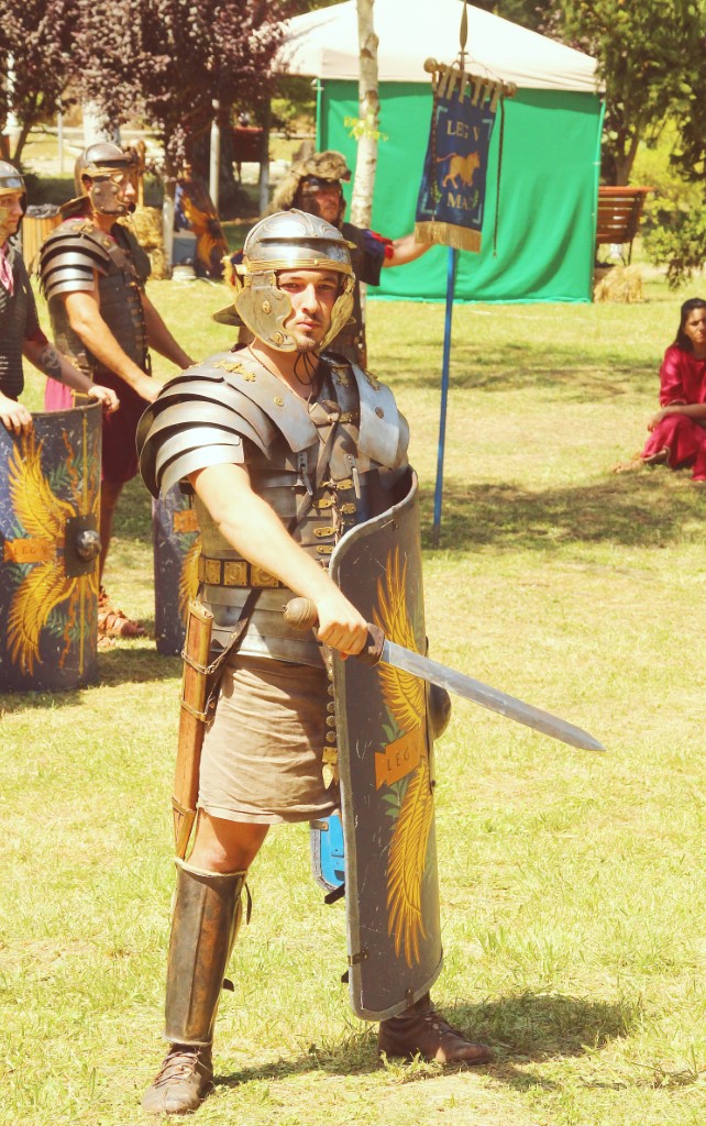 Meteorologii au anunţat o zi caniculară şi previziunile lor întrec aşteptările. Ai impresia că până şi metalul se topeşte. Nici nu e de mirare că, atunci când se dau armurile jos, luptătorii sunt ieşiţi parcă de la saună. Dumitru Ursu, cel care a jucat rolul gladiatorului greu, de-abia respiră: „Luptele au fost dificile pentru că sunt echipat bine şi e foarte cald afară aşa că pierd repede din energie. Cămaşa asta de pe mine din zale, nituită, are vreo 12-14 kg, dar oferă o foarte bună protecţie. Prin urmare, schimb mobilitate şi energie contra protecţie foarte bună. Casca mai cântăreşte şi ea vreo 8 kg, plus tubul cu cârlig de pe mâna stângă are şi el trei sau patru kilograme, dar cel mai uşor e gladius-ul din dreapta, care e din lemn şi are doar câteva sute de grame.”
