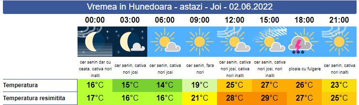 Joi, temperaturile sunt în creștere. Soarele răsare la ora 05:39. În zona noastră, cerul va fi mai mult senin, dar spre a doua parte a zilei, local, se vor înregistra averse însoțite de descărcări electrice, iar vântul va lua aspect de vijelie. La munte instabilitatea va fi mai accentuată. Soarele apune la ora 21:12. Minimele se vor situa între 12 și 14 grade, iar valoarea maximă va urca în jur de 27 de grade.