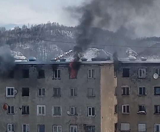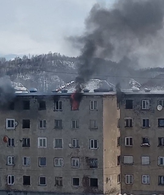 Un incendiu puternic se manifesta într-un bloc de locuințe din municipiul Vulcan. Ultimul etaj al clădirii a fost cuprins de flăcări.
