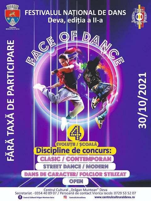 Primăria Municipiului Deva și Centrul Cultural „Drăgan Muntean” Deva va organiza în data de 30 octombrie 2021, cea de-a doua ediție a Festivalului Concurs Național „FACE OF DANCE „.