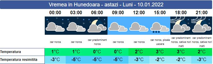 Luni, norii vor domina atmosfera. Soarele va răsări la ora 08:06. Vremea se menține închisă, iar temporar se vor semnala precipitații, în deosebi în zonele înalte, unde va ninge, dar și ploi în restul teritoriului, după orele amiezii. Vântul va sufla slab la moderat cu intensificări la munte, iar izolat se va produce polei și ceață. Soarele va apune la ora 17:05. Valorile termice se vor încadra între 0 și 3 grade.