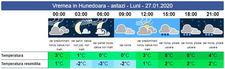 În cursul zilei de luni, vremea va deveni tot mai închisă. Dimineața și seara se formează polei. În zonele joase ceața e prezentă, iar în cursul zilei ploile își vor face apariția. La munte precipitațiile sunt sub formă de ninsoare. Temperaturile minime se vor încadra între 0 și 3 grade, iar cele maxime între 4-5 grade.