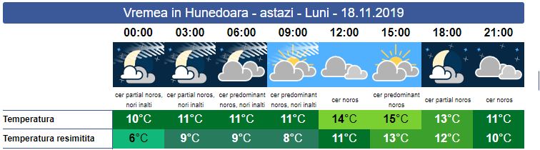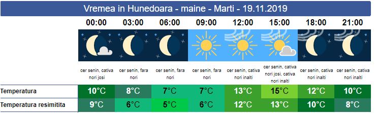 Ziua de marți va debuta cu cer senin. Vremea va fi în general însorită și caldă pentru această perioadă de timp. Dimineață se va produce ceață pe văii și în depresiuni. În zonele de munte, mai ales pe creste vor fi intensificări ale vântului și temporar și pe zonele joase. Temperaturile minime se vor încadra între 5 și 10 grade, iar maximele între 12 și 15 grade.