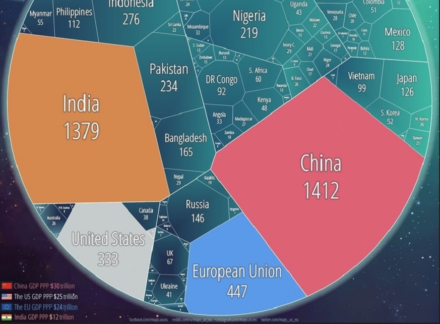 China a fost cea mai populată ţară din lume timp de sute de ani. În 1750, se estimează că avea o populaţie de 225 de milioane de locuitori, mai mult de un sfert din totalul mondial. India, care pe atunci nu era o ţară unificată din punct de vedere politic, avea aproximativ 200 de milioane de locuitori, ceea ce o situa pe locul al doilea. În 2023 va prelua coroana. ONU estimează că populaţia Indiei o va depăşi pe cea a Chinei la 14 aprilie. Se estimează că populaţia Indiei va fi de 1.425.775.850 de locuitori în ziua următoare.