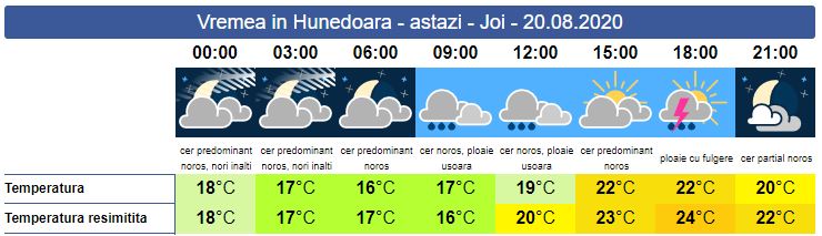 Joi, cerul va fi în mare parte înnorat. Soarele răsare la ora 06:33. În unele zone va continua să cadă ploi ușoare. Temperaturile cresc ușor, dar spre seară pe alocuri, ploile vor fi ceva mai intense și însoțite de fenomene electrice. Se va forma condiții de cădere a grindinei, iar vântul va avea unele intensificări de scurtă durată. Soarele apune la ora 20:29. Temperatura maximă se va resimți în jurul valorii de 24 de grade.