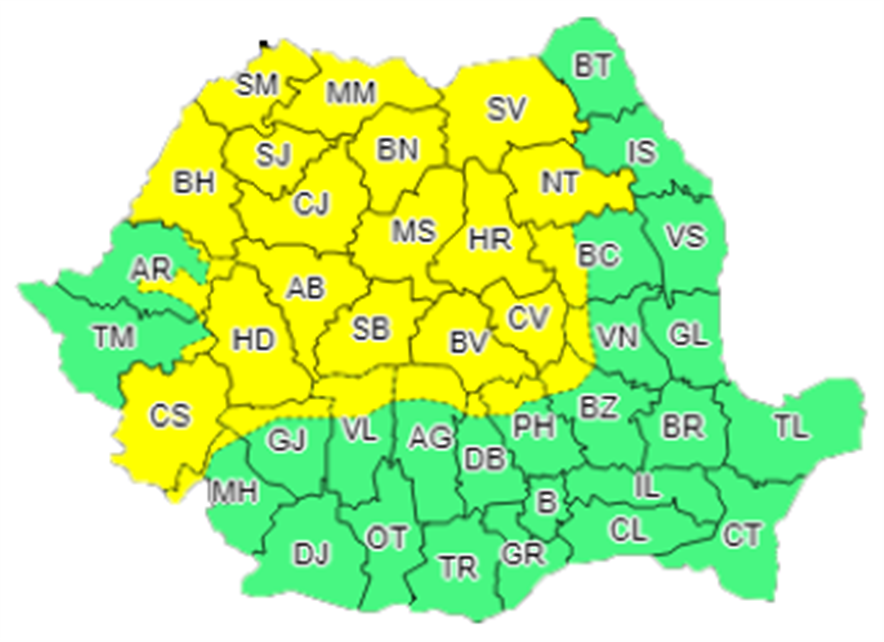 De duminică și până luni seara, vor fi perioade cu instabilitate atmosferică accentuată în zonele de munte, precum și în Crișana, Maramureș, Transilvania și nordul Moldovei. Vor fi averse care vor avea și caracter torențial, frecvente descărcări electrice, intensificări de scurtă durată ale vântului cu aspect de vijelie și căderi de grindină.