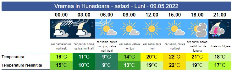 Luni, temperaturile scad ușor față de ziua anterioară. Soarele răsare la ora 06:03. Cerul va fi mai mult senin, doar spre sfârșitul zile, local, e posibil să se înnoreze și să cadă precipitații însoțite de descărcări electrice. Vântul va sufla slab la moderat cu intensificări temporare pe timpul instabilității atmosferice. Soarele va apune la ore 20:46. Valorile termice vor urca în jurul valorii de 22 de grade.