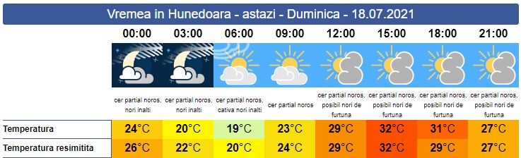 Duminică, va fi o zi și frumoasă și instabilă. Soarele va răsări la ora 05:44. Cerul va fi variabil cu înnorări accentuate pe alocuri mai ales după miezul zilei. Disconfortul termic va fi accentuat. Soarele apune la ora 21:15. Temperaturile minime se vor situa între 19 și 13 de grade, iar cele maxime vor depăși 31 de grade.