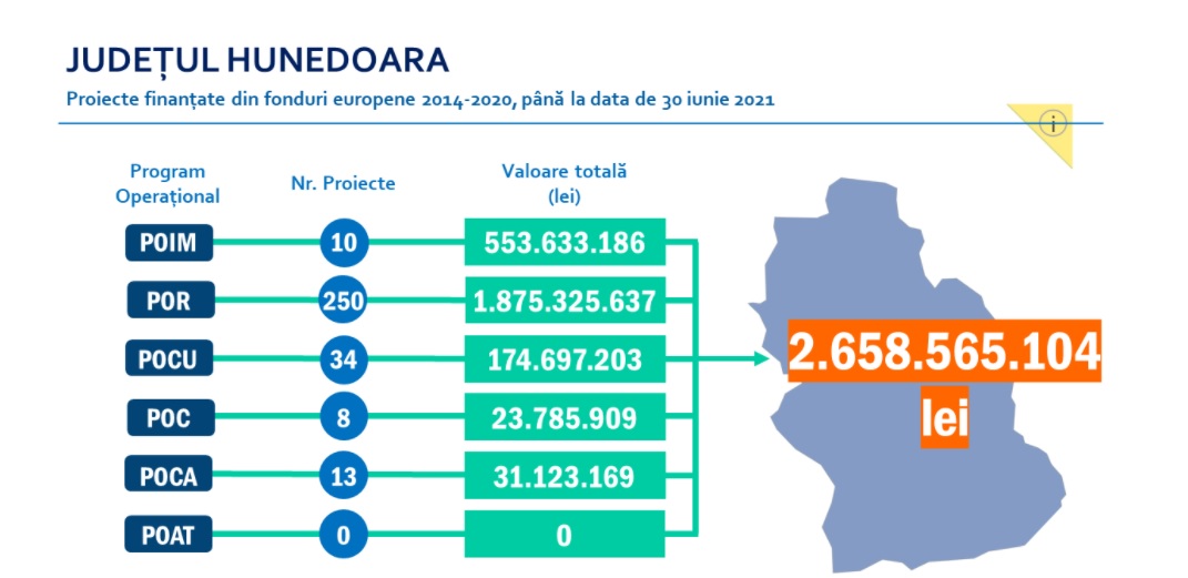 Ministerul Fondurilor Europene a publicat harta finanțărilor din fonduri europene până la data de 30 iunie 2021. La nivelul județului se află în derulare sau implementate 315 contracte, în valoare de 2.658.565.104 lei.
