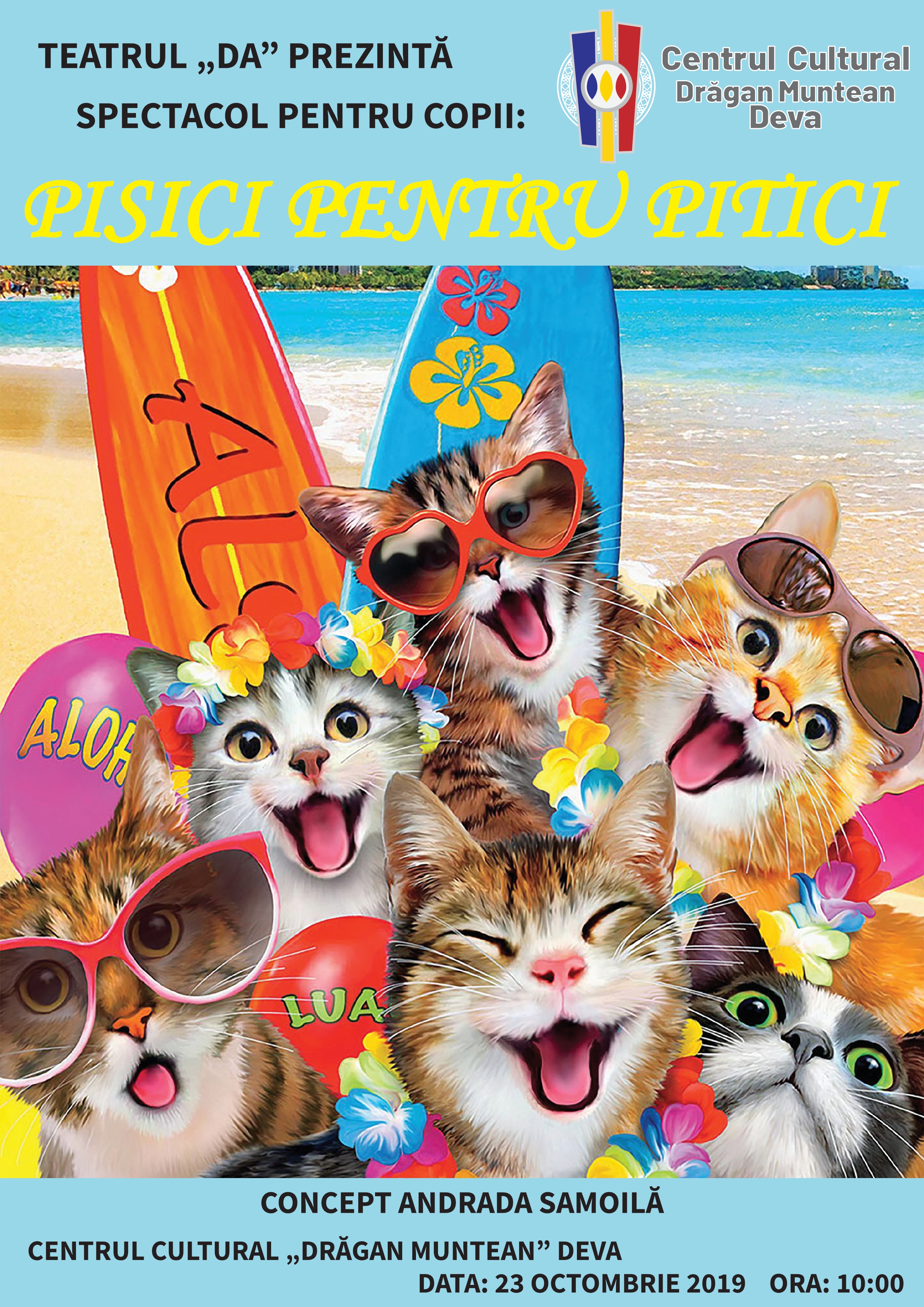 ”Pisici pentru pitici” este titlul spectacolului pe care Teatrul ”DA” îl prezintă, miercuri, 23 octombrie 2019, la ora 10:00, pe scena Centrului Cultural ”Drăgan Muntean” din Deva.