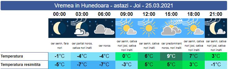 Joi, dimineața va fi rece și se va produce bruma. Soarele răsare la ora 06:21. Peste zi, chiar dacă mercurul din termometrele urcă cu 1-2 grade, vremea se menține rece pentru ultima săptămână a lunii martie. Până spre amiază cerul va fi variabil spre senin, apoi posibil să apără și norii. Vântul va sufla slab, cu unele intensificări la munte. Soarele apune la ora 18:47. Temperaturile minime se vor situa între -4 și 3 grade, iar maximele între 6 și 9 grade.