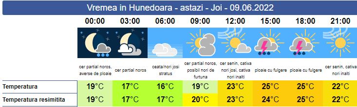 Joi, se va resimți o ușoară scădere a temperaturilor. Soarele răsare la ora 05:37. Cerul se va înnora treptat, iar spre a doua parte se vor aștepta precipitații însoțite de descărcări electrice. Vântul va sufla slab spre moderat cu unele intensificări la munte. Soarele va apune la ora 21:17. Maxima zilei va urca spre 25 de grade.