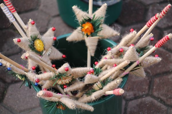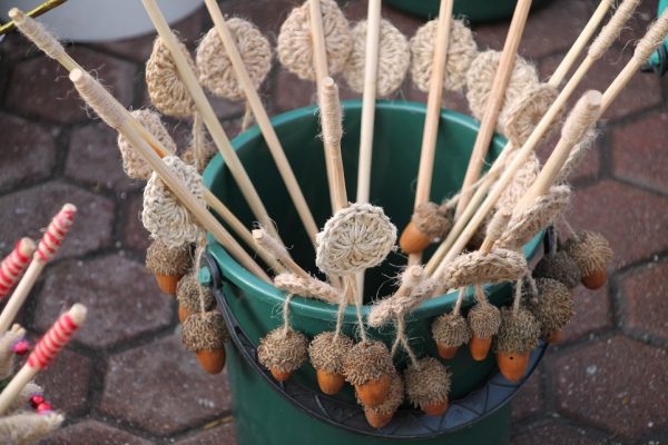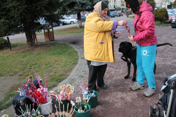 flori galbene de paie. Pe altă bâtă, femeia a prins o mică roată din sfoară de care atârnă două ghinde. Totul e natural, lucrat de mână, îngrijit şi potrivit cu motivele româneşti.