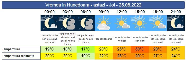 Joi, prognoza meteo anunță că zilele caniculare vor reveni. Soarele răsare la ora 06:38. Cerul va fi parțial noros, dar până spre amiază se va degaja treptat. Vântul va sufla slab și moderat. La munte mai există posibilitatea să cadă averse slabe. Soarele va apune la ora 20:22. Minimele se vor încadra între 17 și 20 de grade, iar maximele vor urca în jurul valorii de 30 de grade.