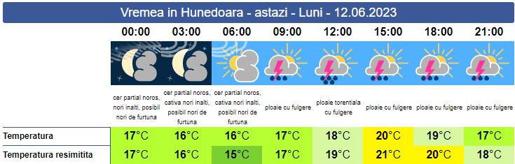 Luni, vremea în zona noastră se menține instabilă și răcoroasă pentru acestă data. ANM, în urmă cu puțin timp a emis două coduri de instabilitate atmosferică severă, unul portocaliu de ploi torențiale, în partea de nord, vest și estul județului, iar în partea de sud, cod roșu de ploi abundente. Astăzi, temperaturile variază între 18 și 20 de grade.