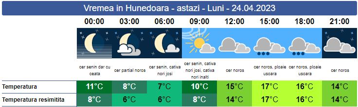 Luni, în zona noastră, se anunță instabilitate atmosferică. Soarele răsare la ora 06:26. Cerul va fi mai mult noros și se vor înregistra precipitații pe arii extinse. La munte, precipitațiile vor fi sub formă de lapoviță și ninsoare. Vântul va sufla slab și moderat cu unele intensificări. Soarele va apune la ora 20:26. Minimele se vor situa în jurul valorii de 8 grade, iar maximele în jurul valorii de 17 grade.
