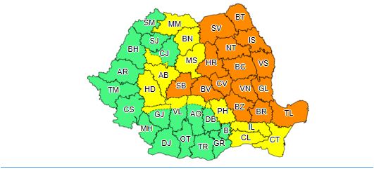 În Moldova, nord-estul Munteniei, nordul Dobrogei și în sudul și estul Transilvaniei, vor fi perioade cu instabilitate atmosferică accentuată ce se va manifesta prin averse ce vor avea și caracter torențial, descărcări electrice, intensificări de scurtă durată ale vântului, vijelii și grindină. Cantitățile de apă vor depăși 30…40 l/mp și, pe arii restrânse, 50…70 l/mp.”