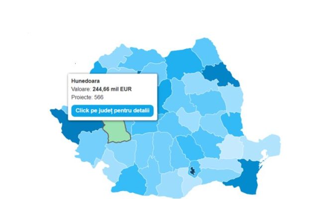 Analiza regională a hărții interactive arată implicarea modestă a județului Hunedoara. Potrivit datelor publice, valoarea totală a proiectelor din județul Hunedoara este de 244,66 milioane euro. În județ sunt în implementare un număr de 566 de proiecte.